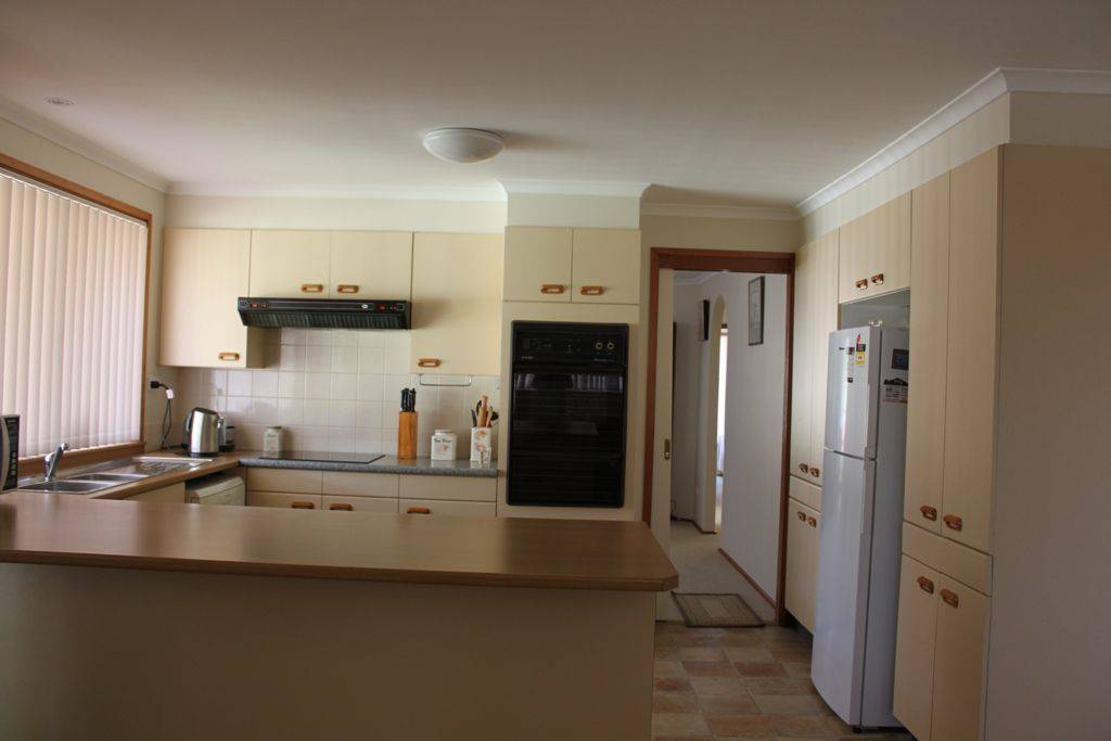 * well appointed kitchen with electric oven and hotplates, rangehood, dishwasher, good storage & breakfast bar