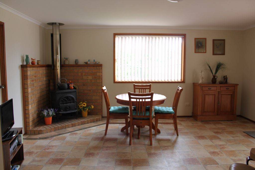 * family room with cast-iron wood fire, split-system air conditioning and sliding doors to covered pergola