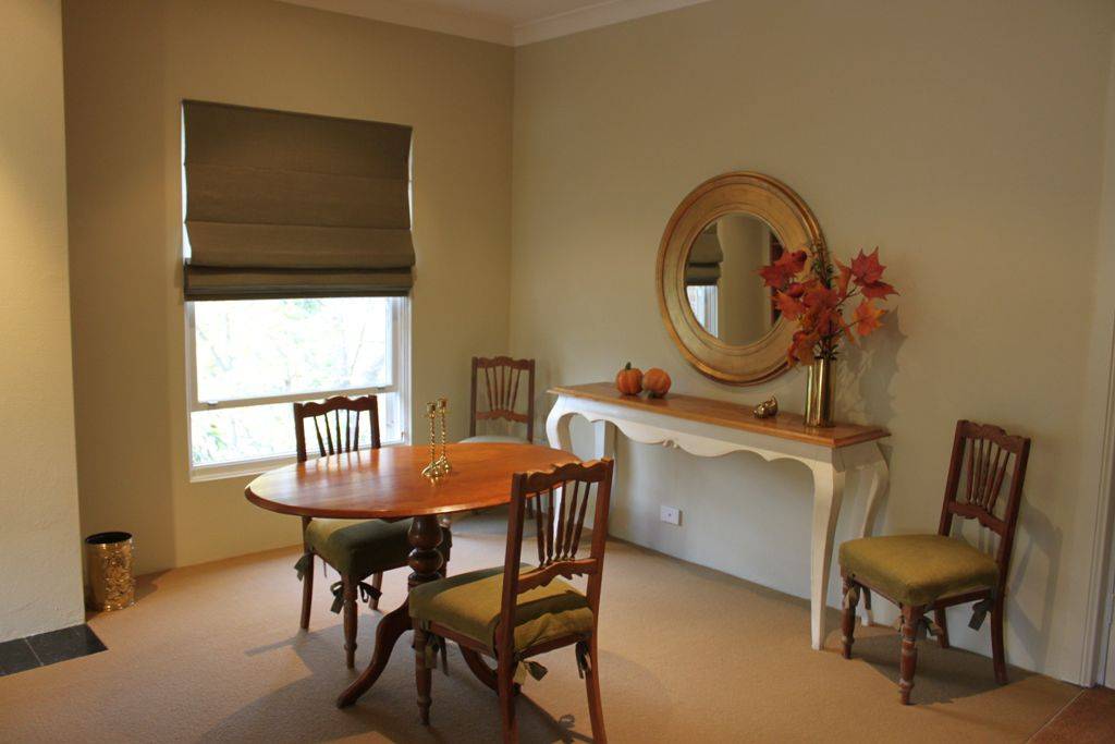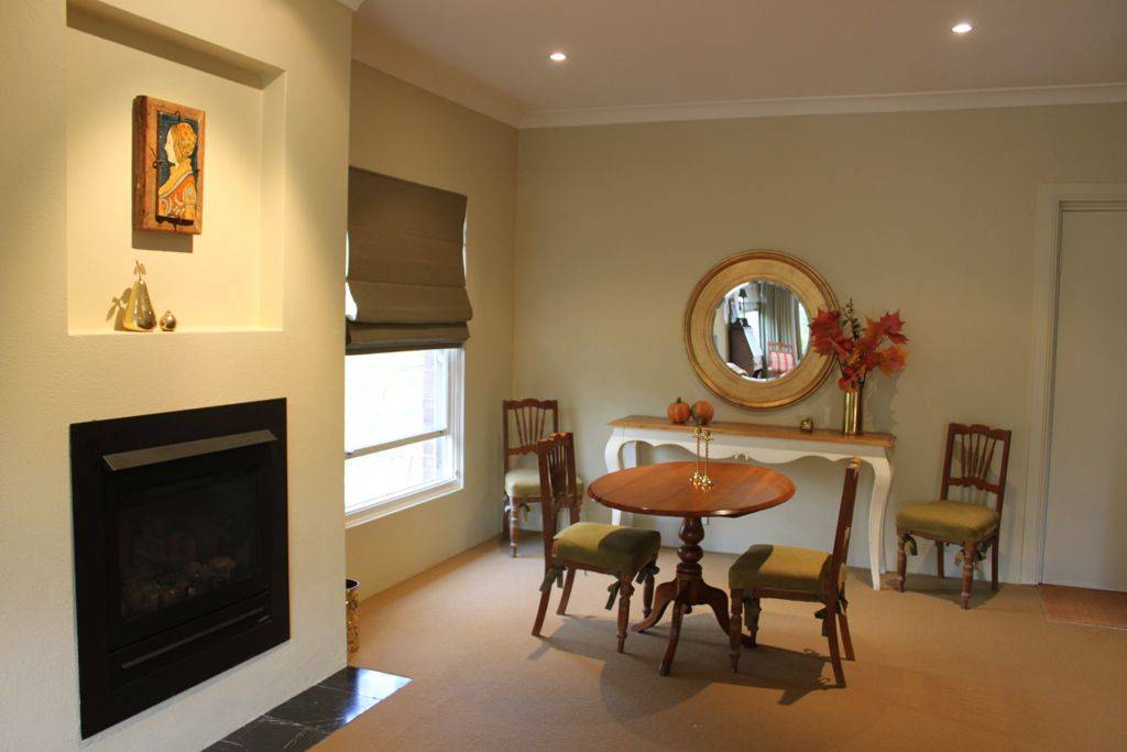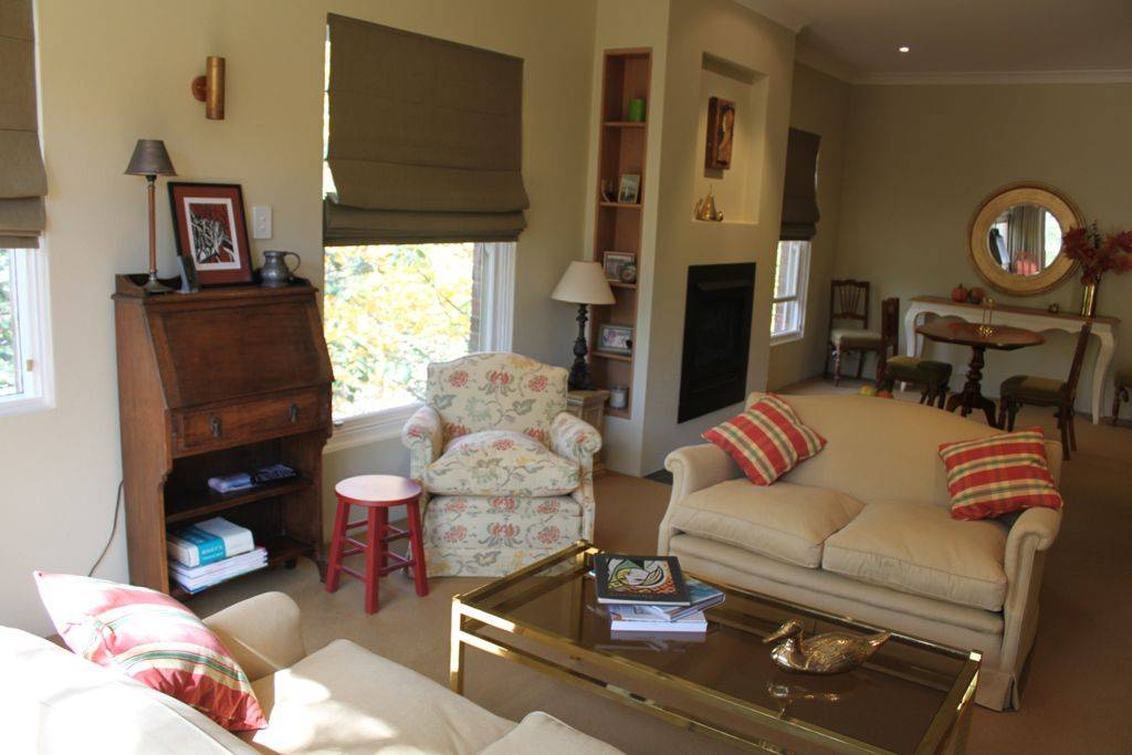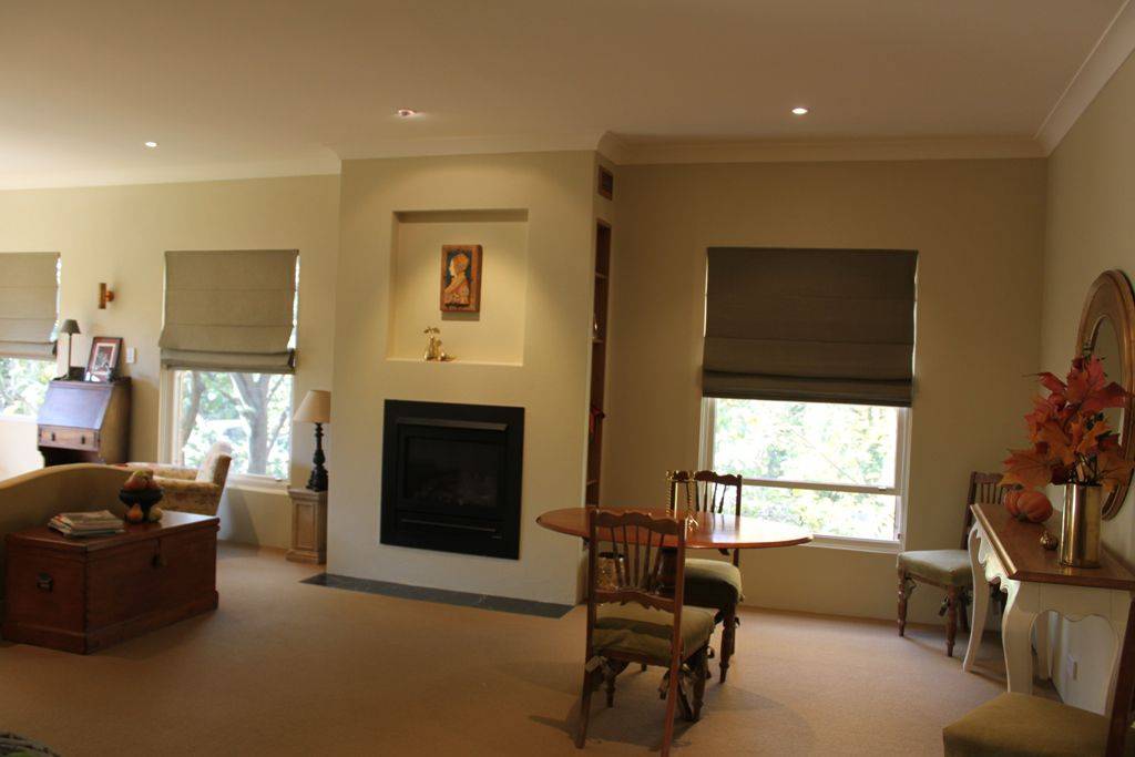* Large lounge and dining with remote controlled gas log fire, built-in bookcases and quality French linen drapes and Roman blinds