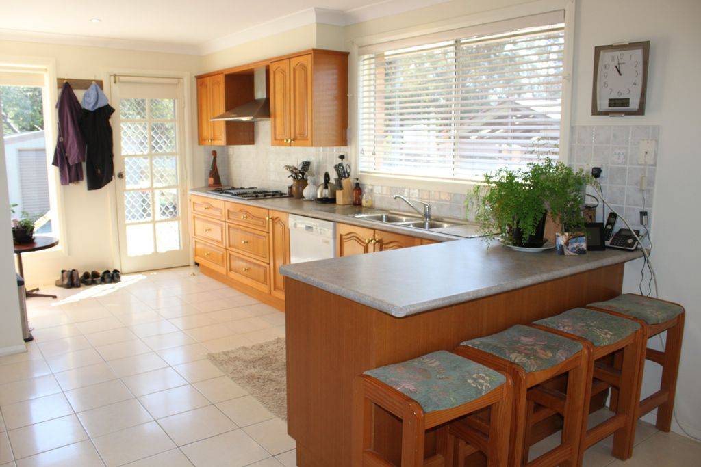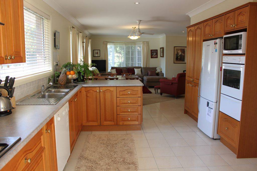 * Timber kitchen with gas oven, gas cooktop, stainless steel flue, Bosch dishwasher & breakfast bar
