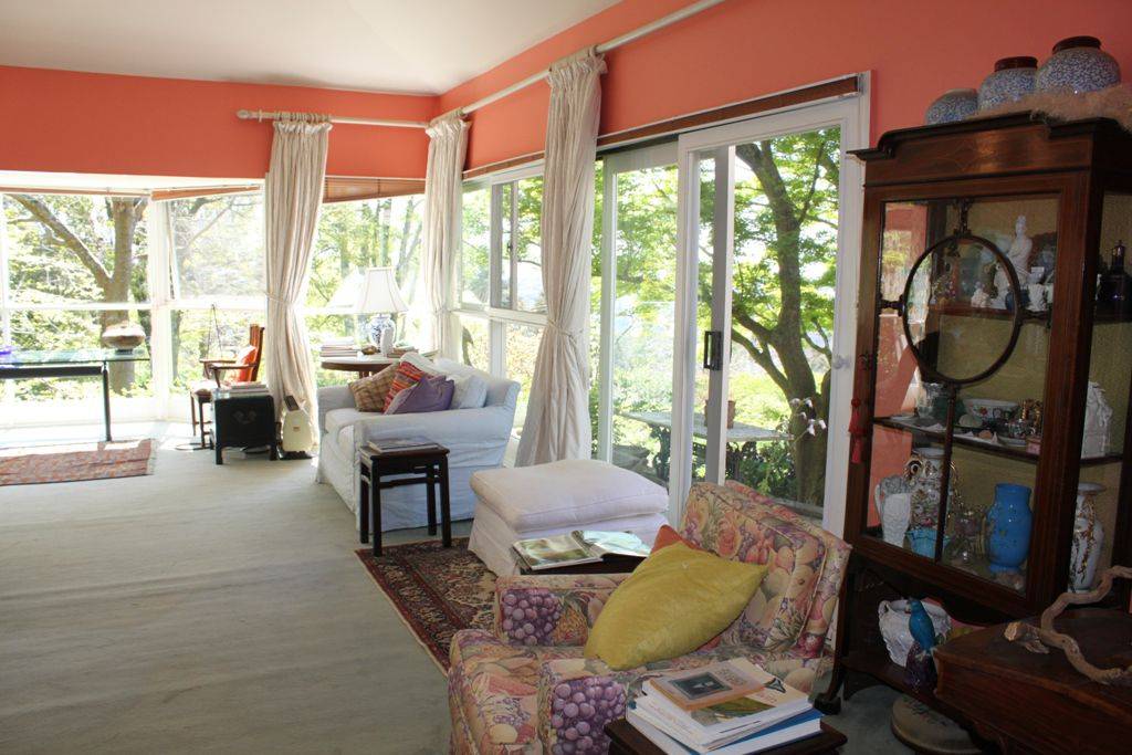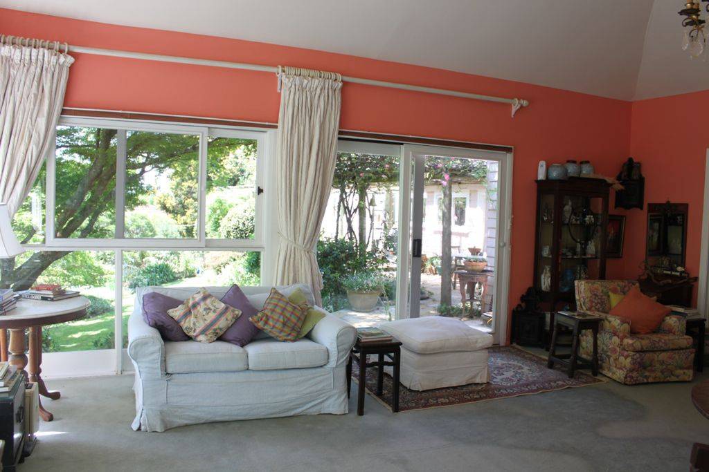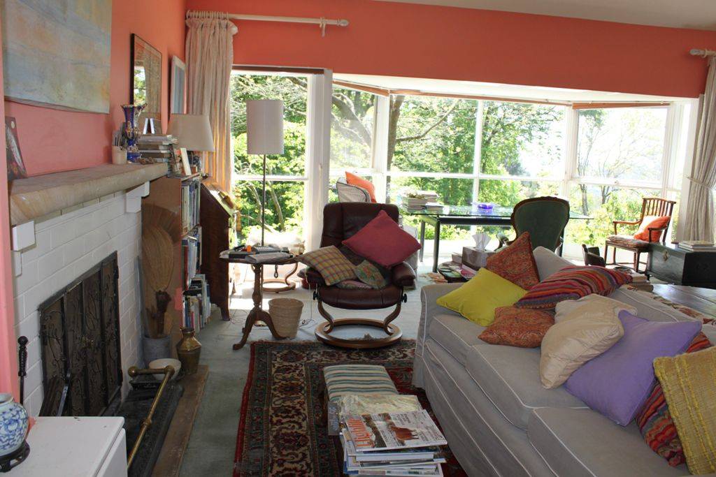 * large sitting room with open fire, picture windows, vaulted ceilings and sliding doors to terrace