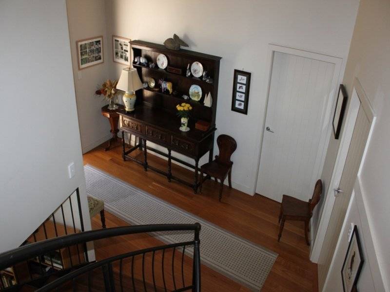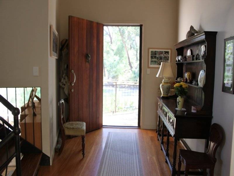 * wide entrance foyer with blackbutt timber flooring, solid timber 'blackbean' door & vaulted ceilings