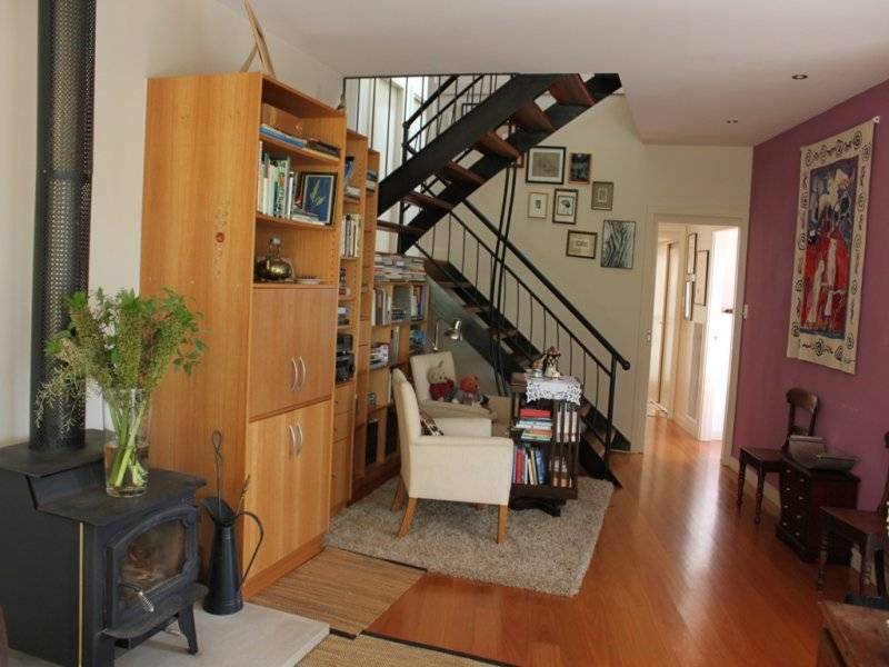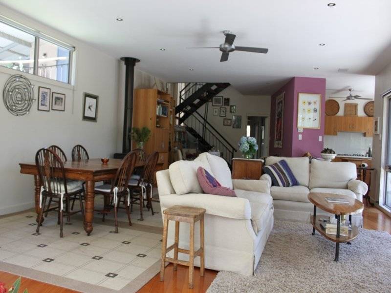 * open plan lounge & dining with timber flooring, wood fire & doors to deck