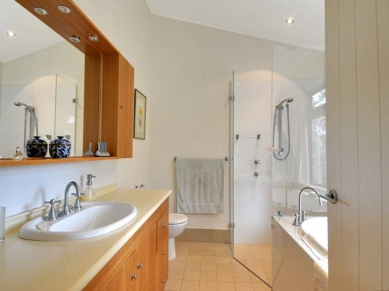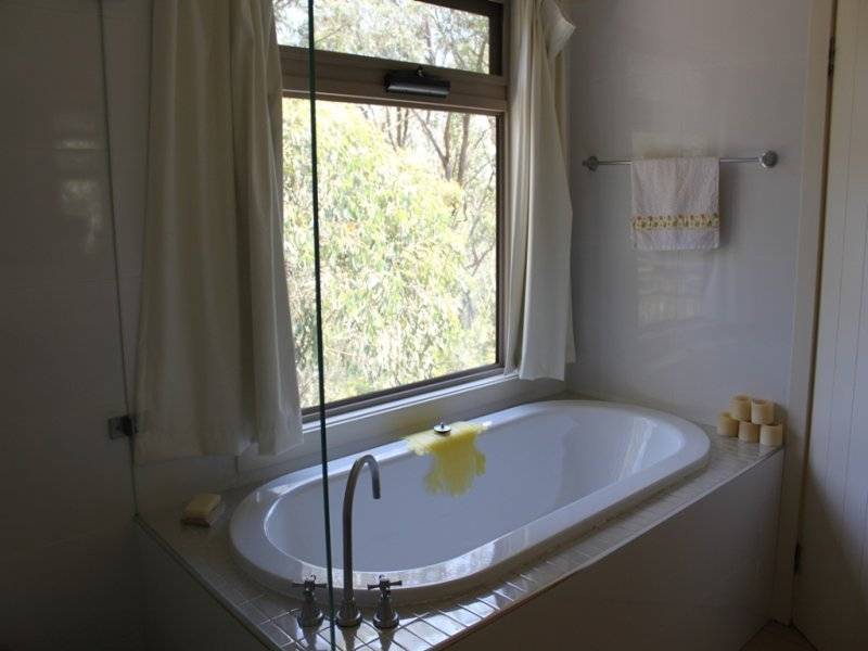 * full bathroom to main bedroom with deep bath, frameless shower, timber vanity, w.c., under-floor heating & bush vistas