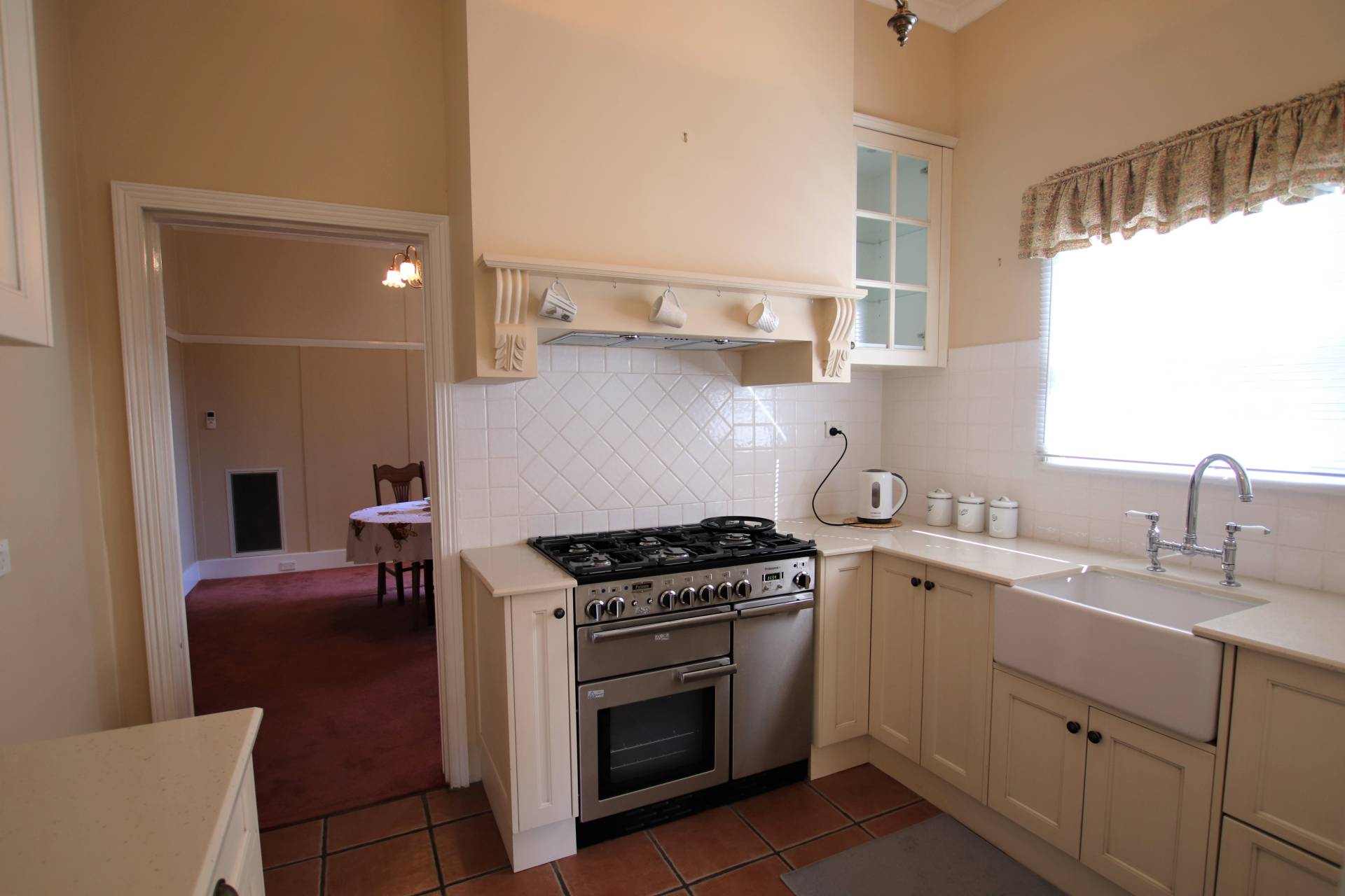 * Superbly appointed kitchen with 'Falcon' double oven, 5 burner gas cooktop, flue, 2 drawer  dishwasher, 'lab' sink, appliance cupboard and terracotta floor tiles