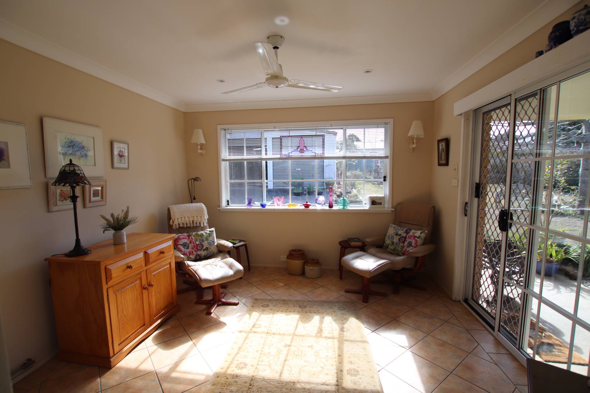 * Sunroom (tiled) with garden views and door to outside