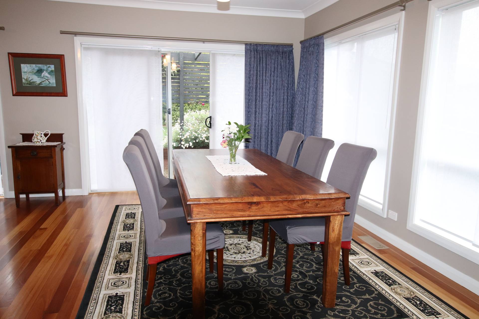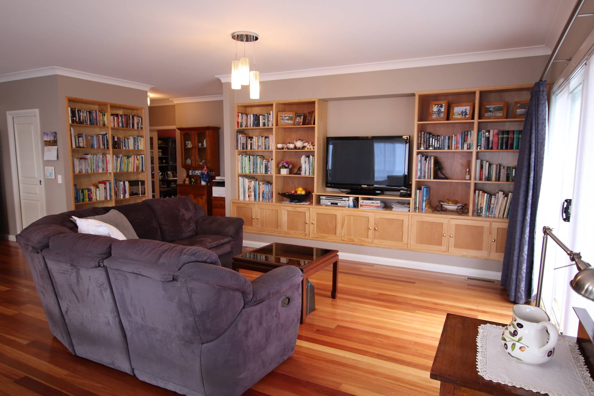 * Open plan casual meals area and family room with built-in wall unit and sliding doors to rear deck and garden