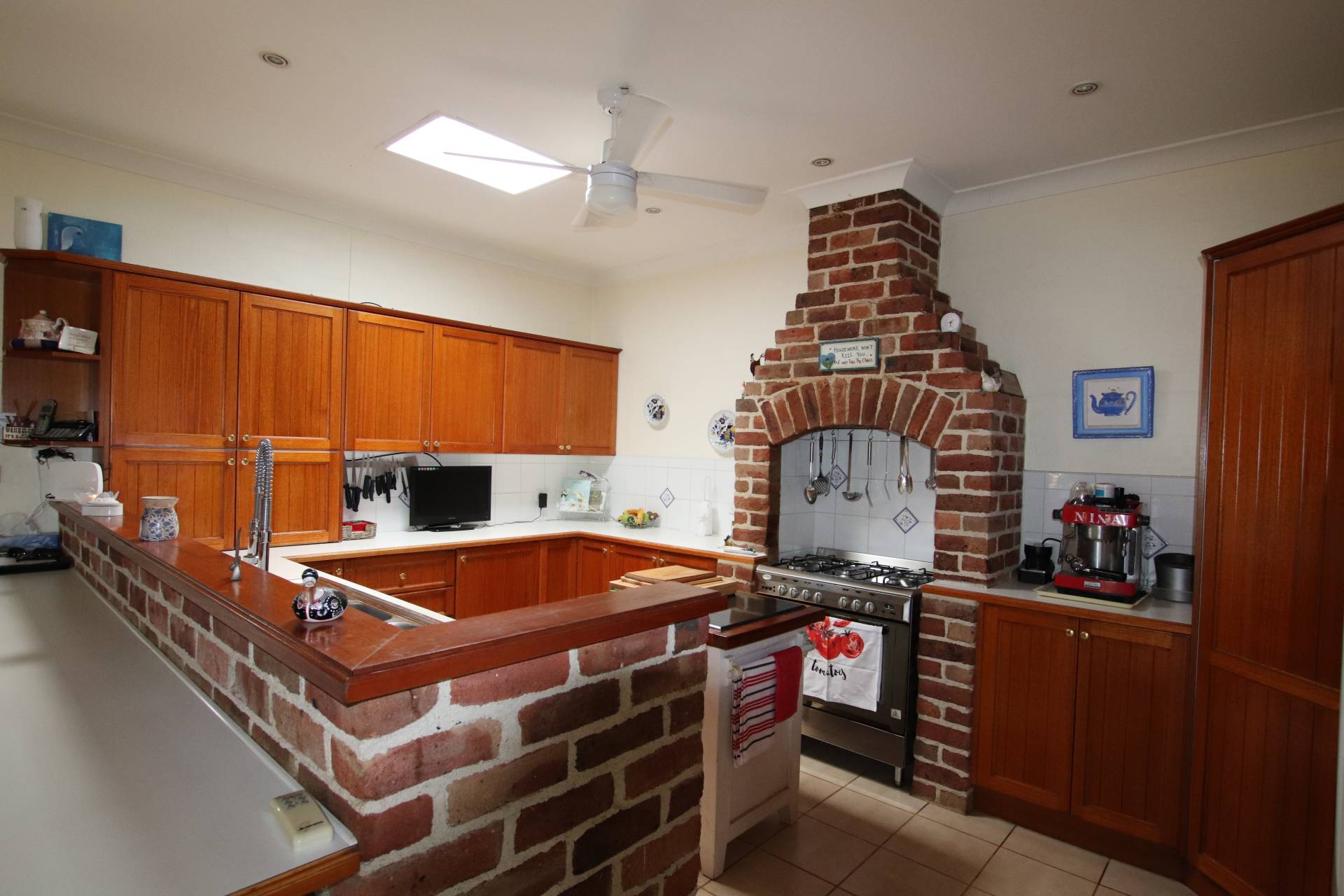 * Timber kitchen with 'Emelia' oven and gas cooktop, flue, dishwasher, breakfast bar, pantry and ceiling fan