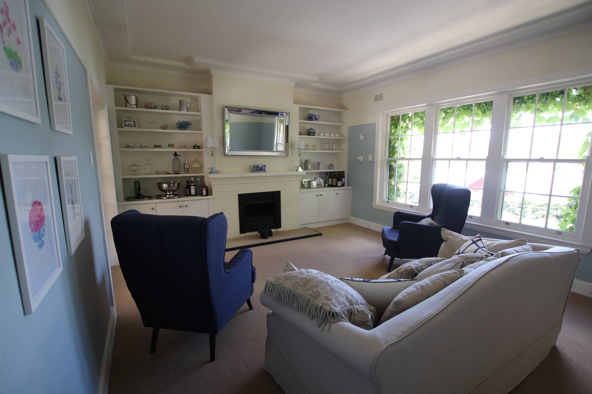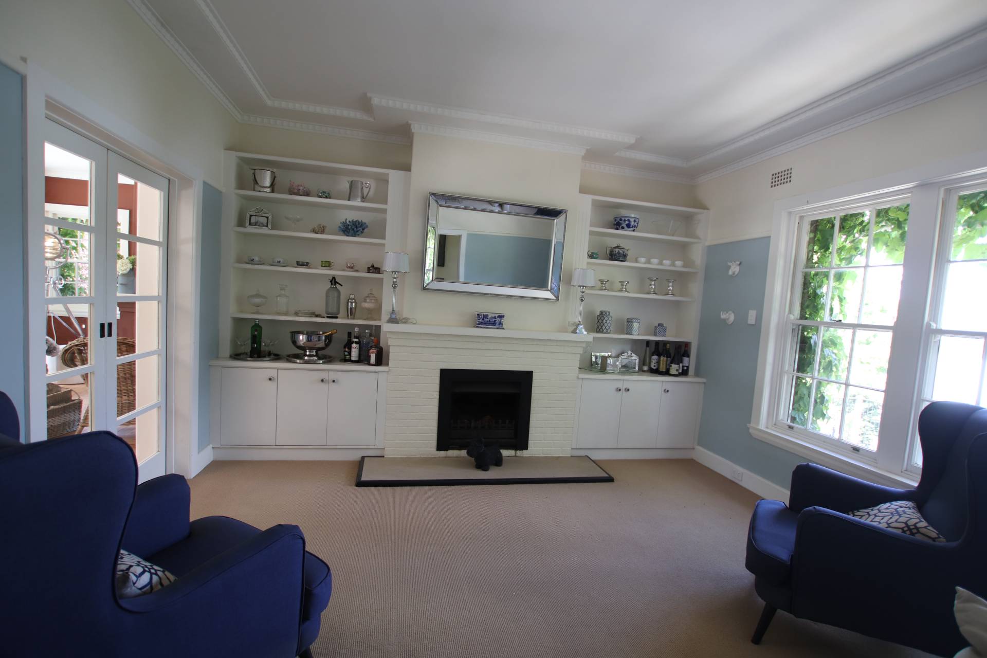 * Formal lounge with Jetmaster open fire,  built-in bookshelvers, French doors and garden views