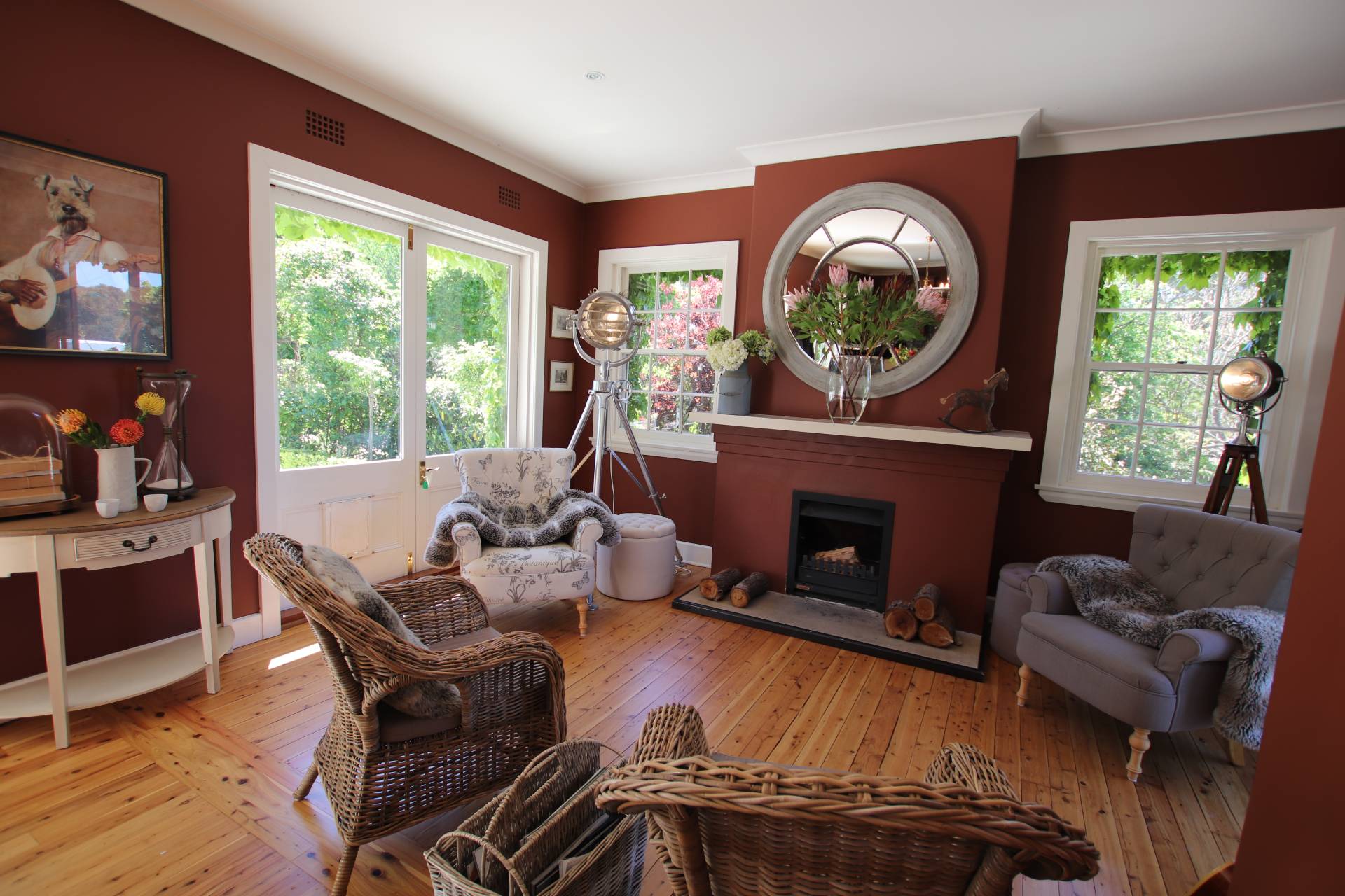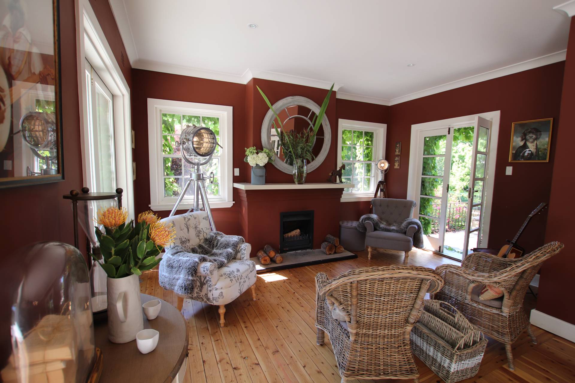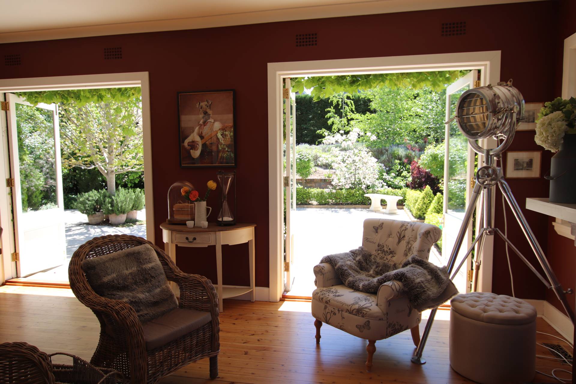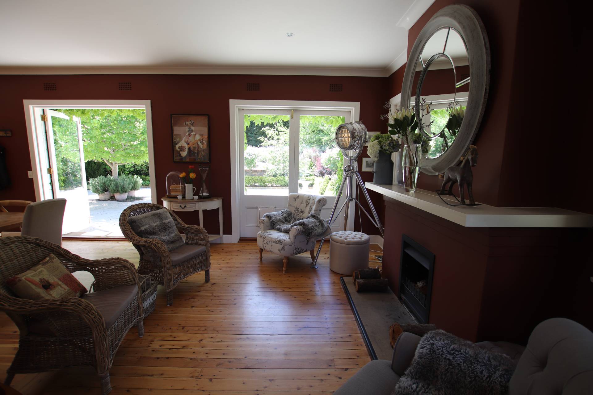 * Casual sitting room with Jetmaster open fire and French doors to private patio overlooking the pool