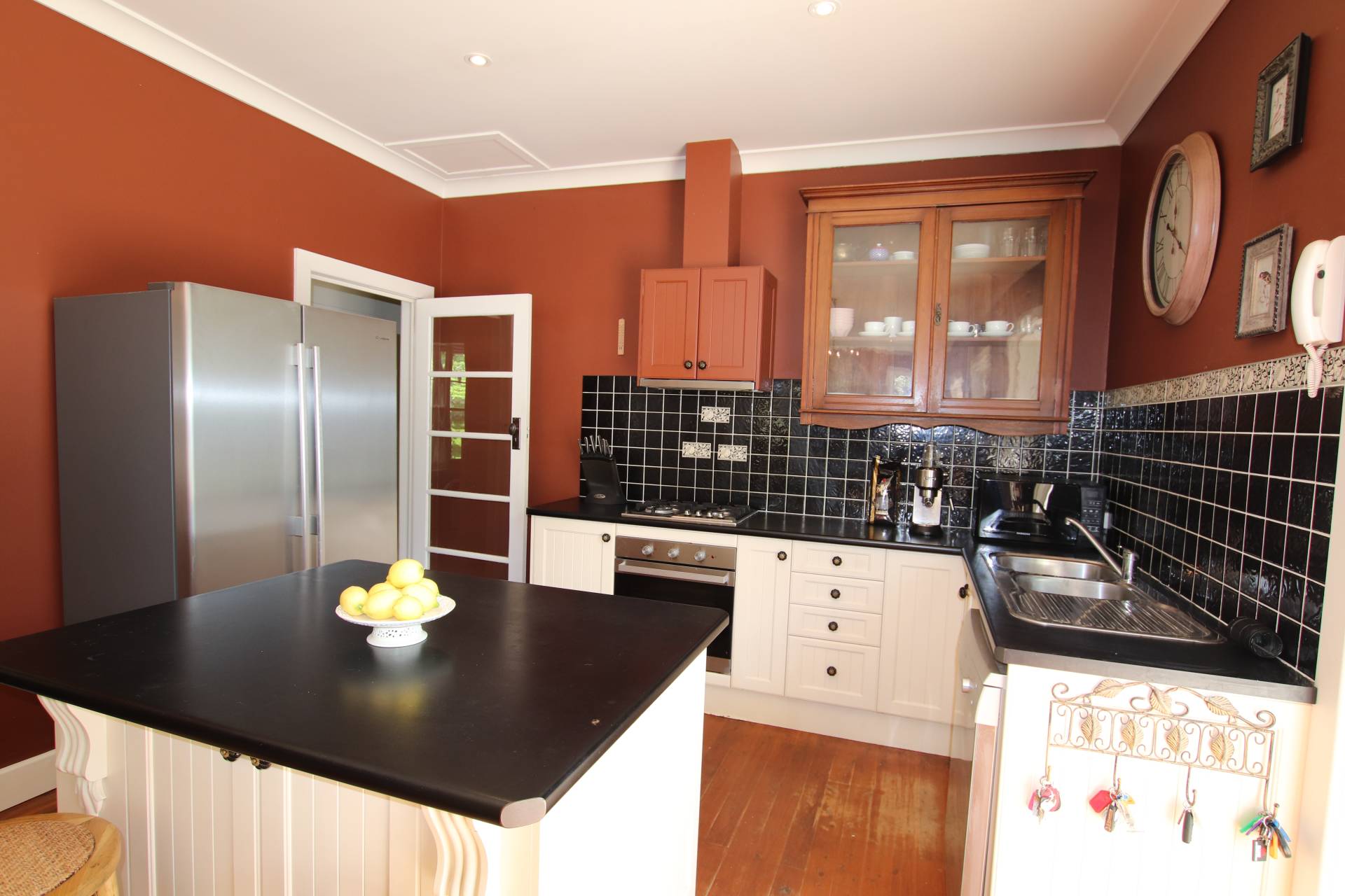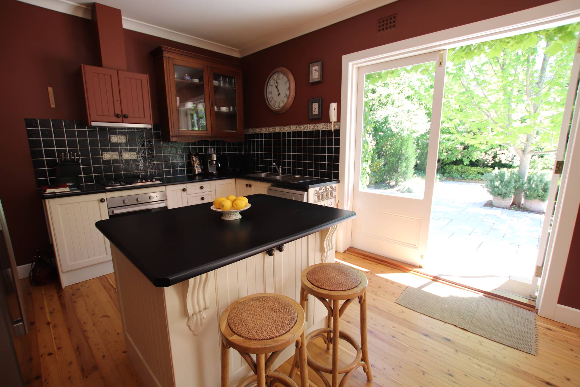* Country-style kitchen with electric oven, gas cooktop, exhaust fan, dishwasher, island bench and French doors to large, paved terrace