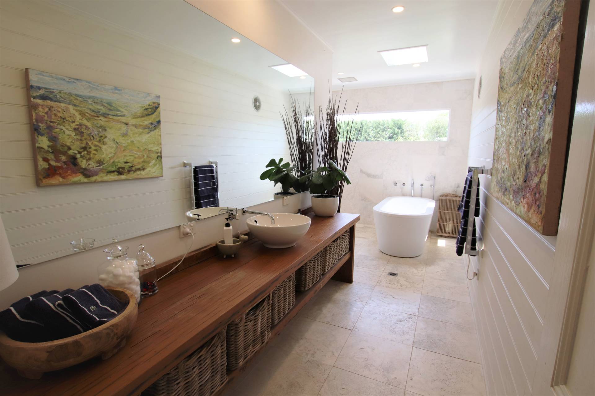 Bathroom 1: with freestanding bath, rainwater shower, Travertine tiling, under-floor heating, solid timber bench with vanity, skylight and a timber-lined wall