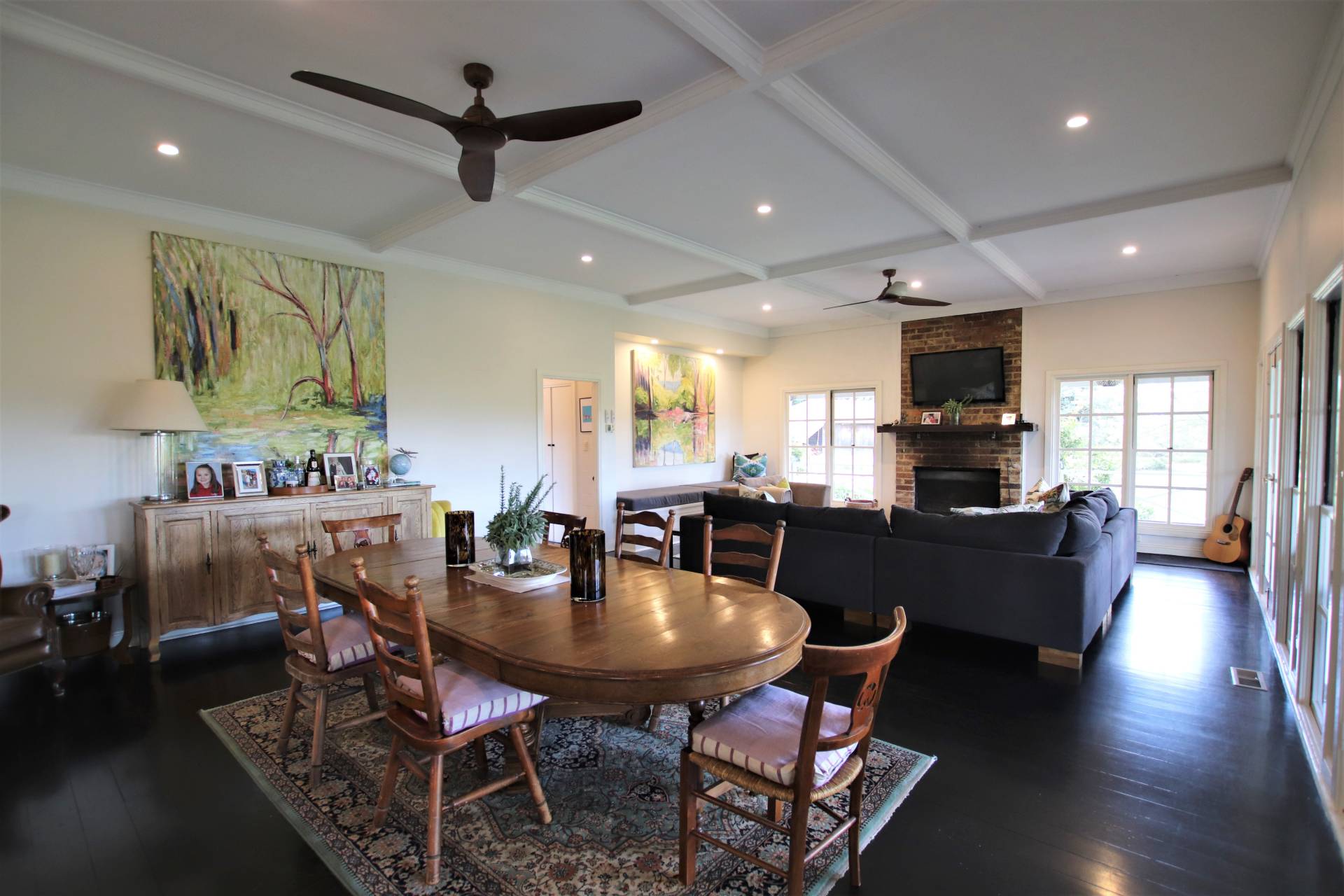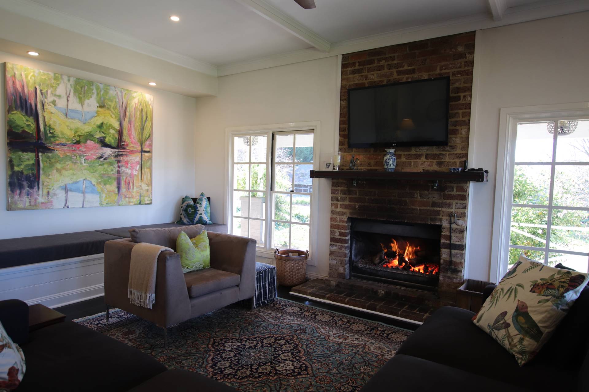* Open plan lounge and dining with open fire in brick surround, picture windows with garden vistas and French doors to wide, sunny vernadah overlooking the paddock and vines