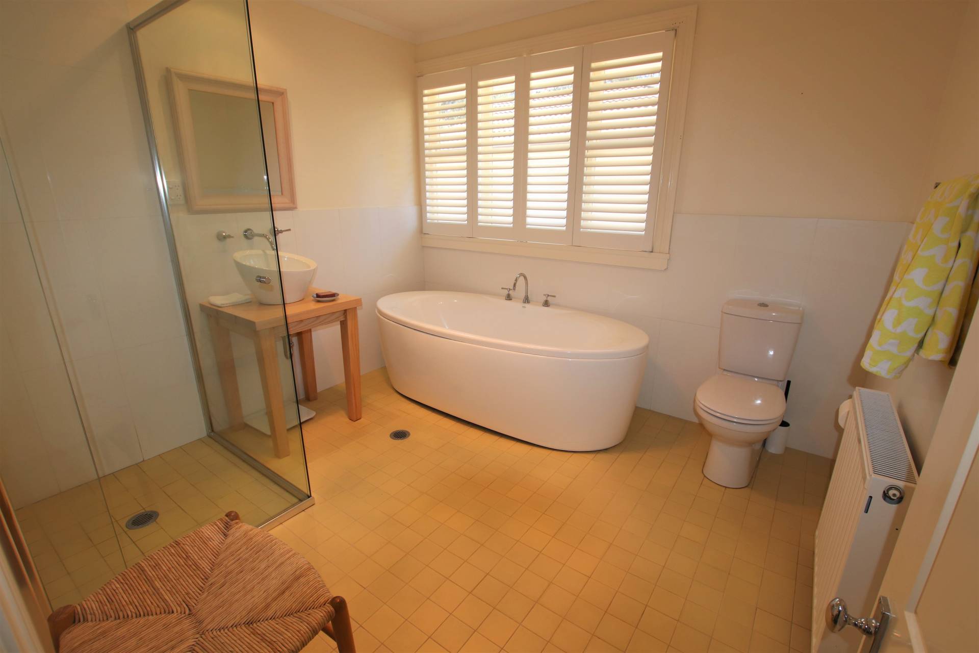 * Main bathroom with freestanding bath, shower, vanity, tastic lights, w.c., heating and plantation shutters
