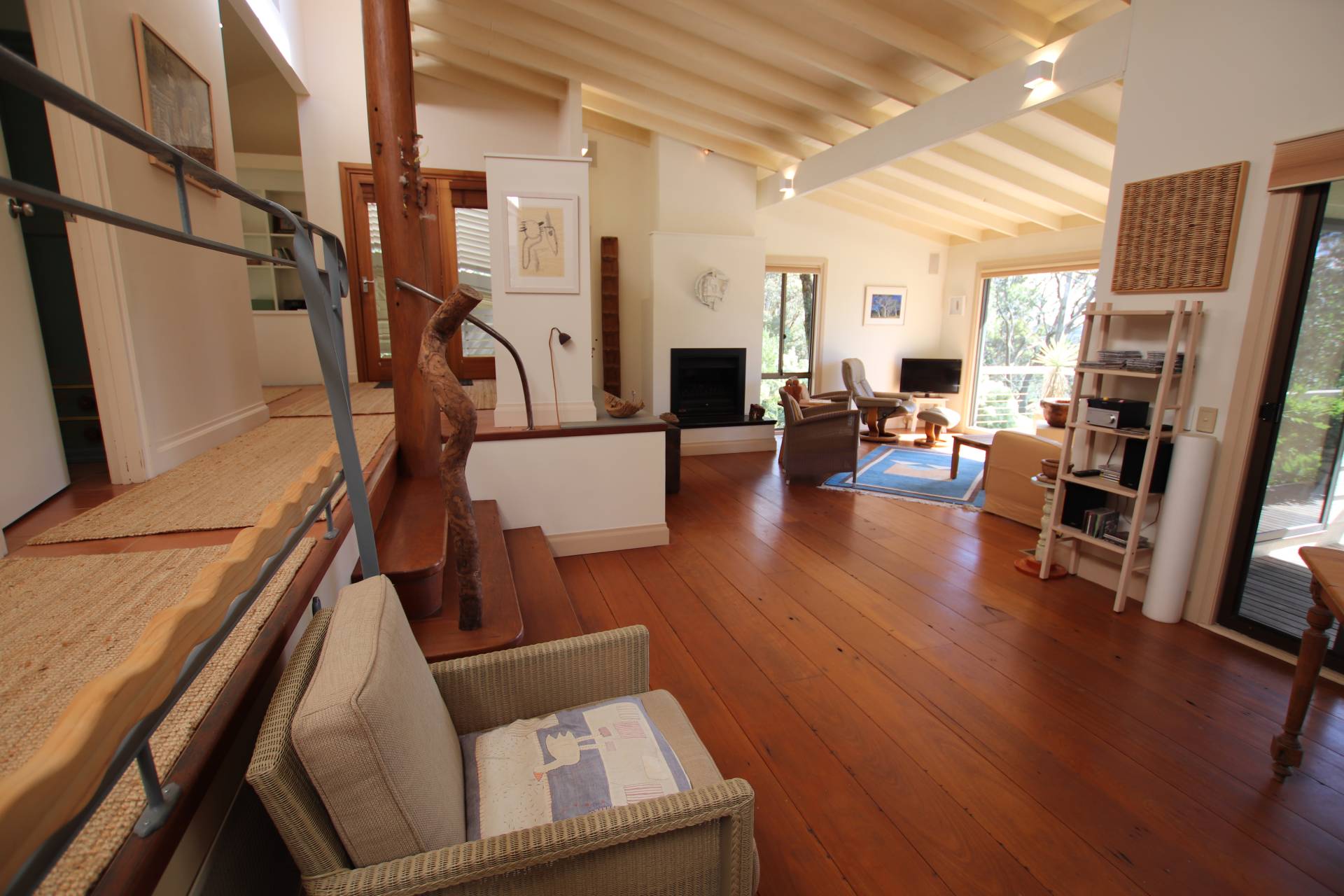 * Generous sitting room with gas log fire, raked ceilings, solid timber floors, a large picture window with a retractable canvas blind and doors to deck