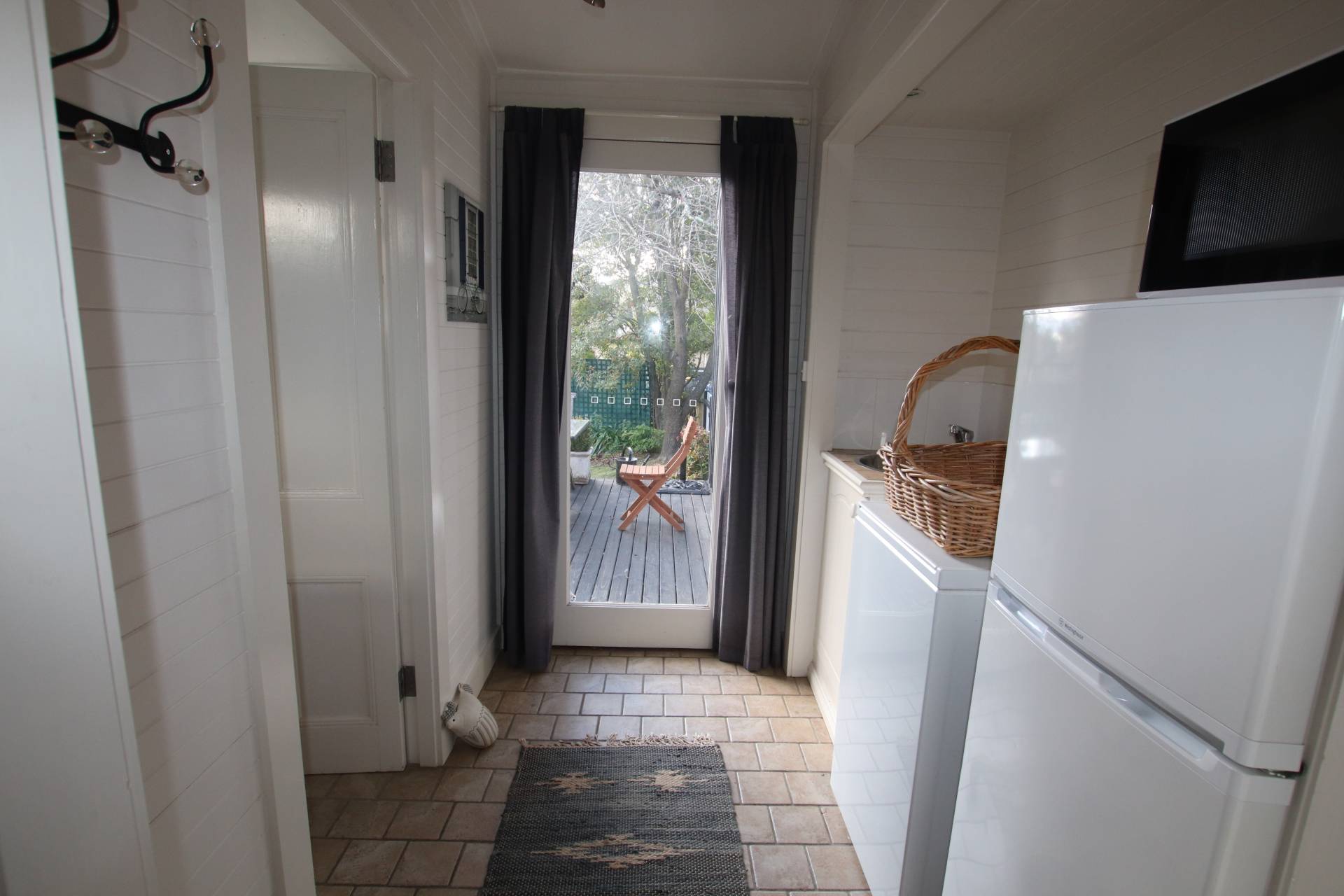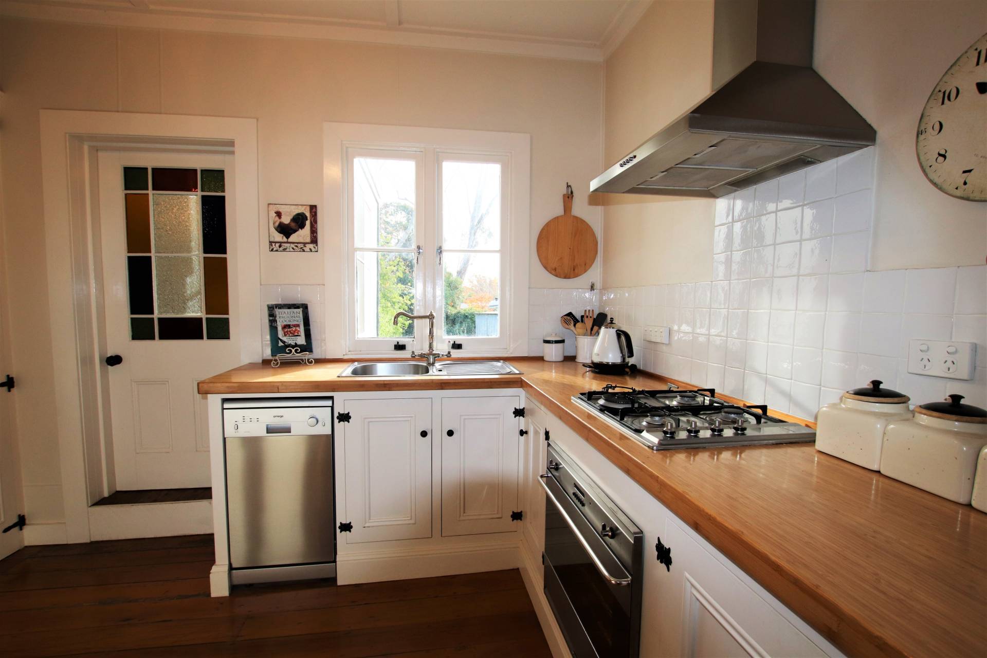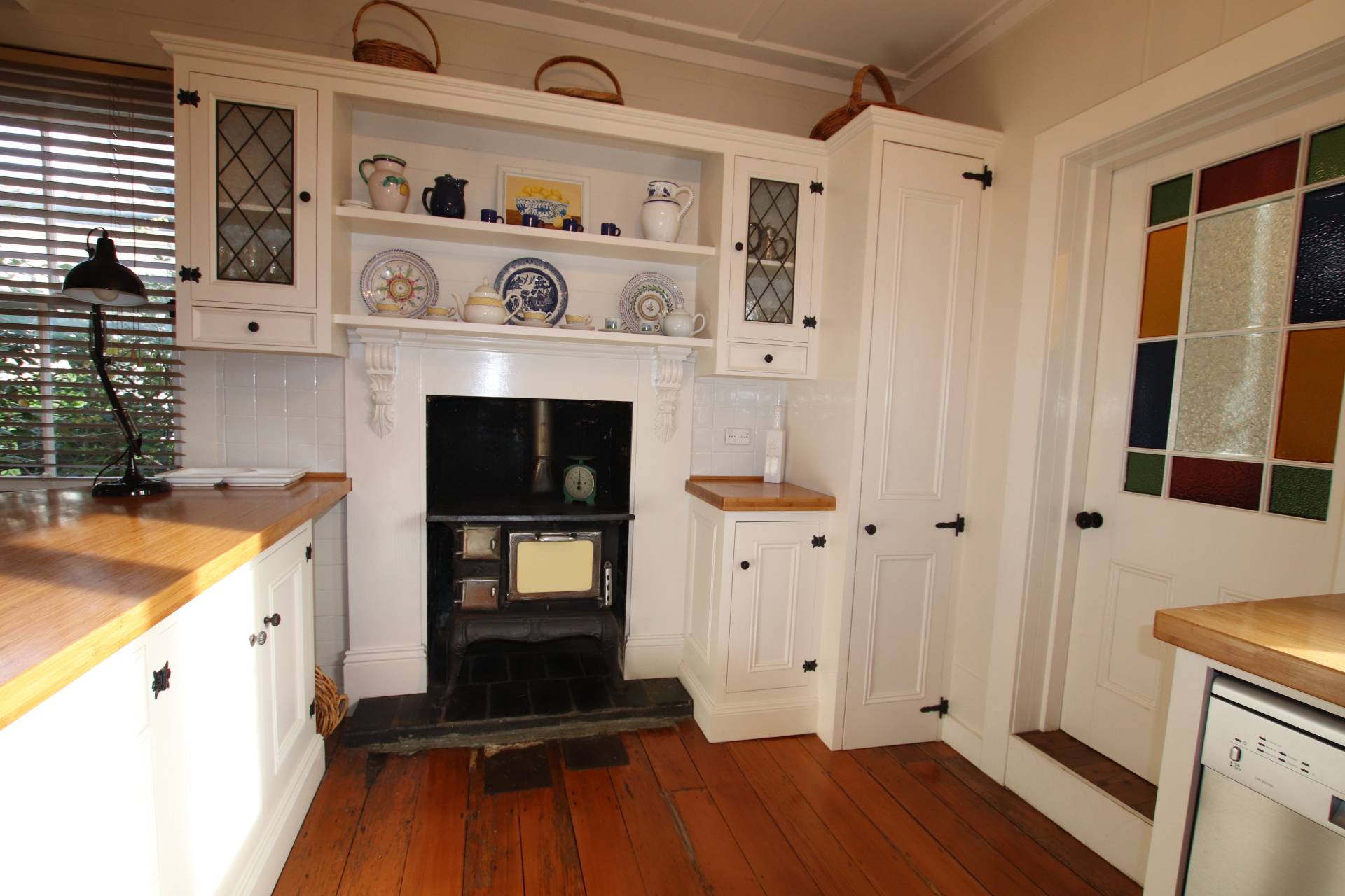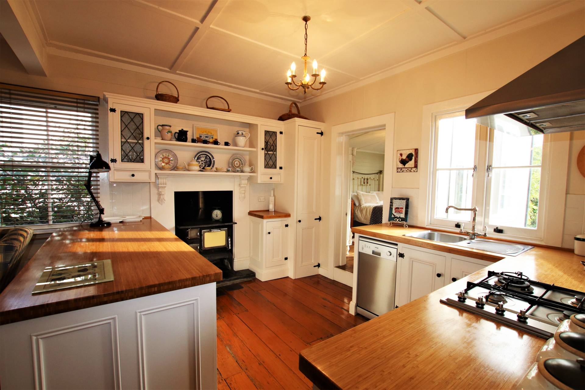 * Well appointed kitchen with electric oven, gas cooktop, stainless steel flue, pressed bamboo benchtops, ornamental stove in brick surround, good storage and garden vistas