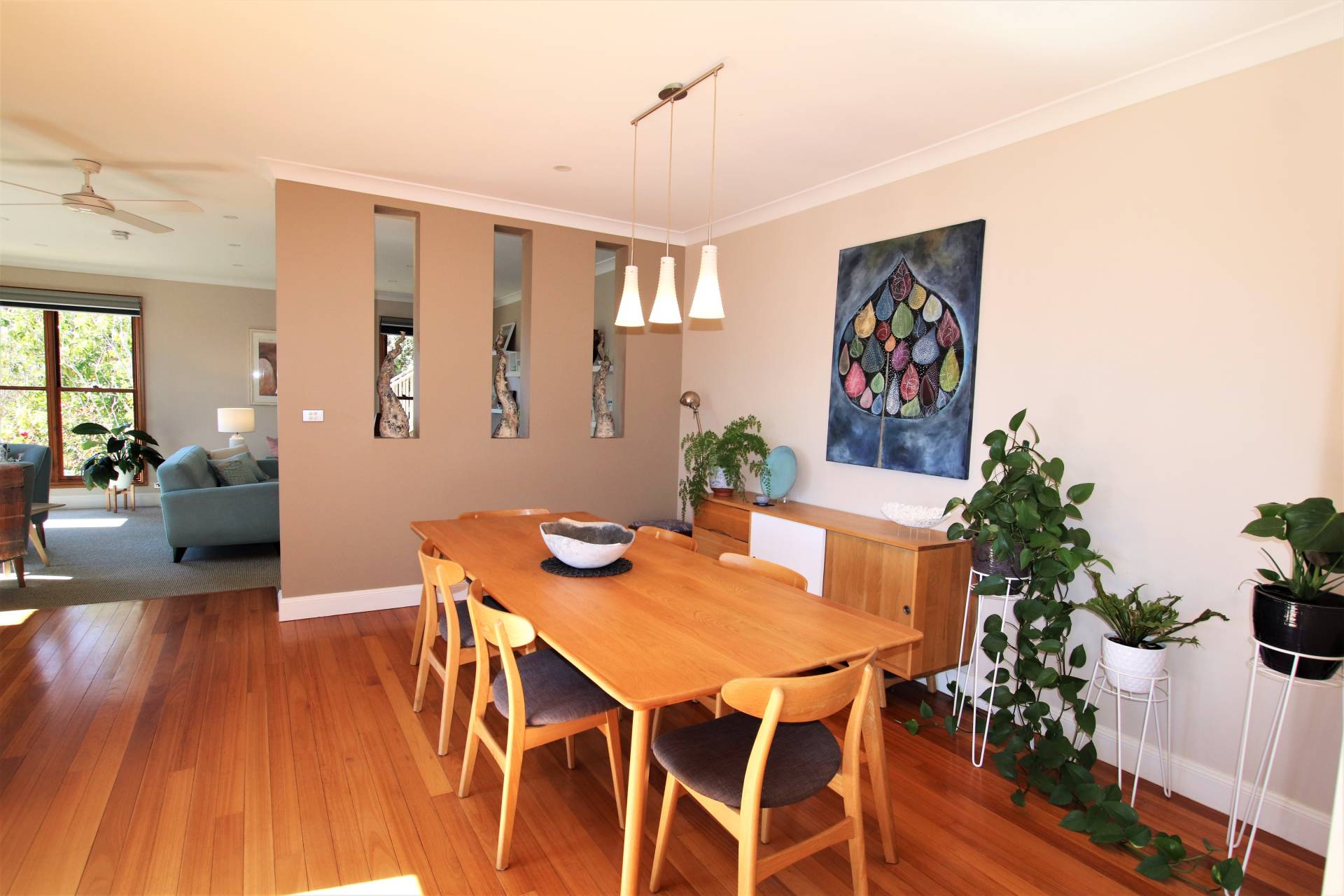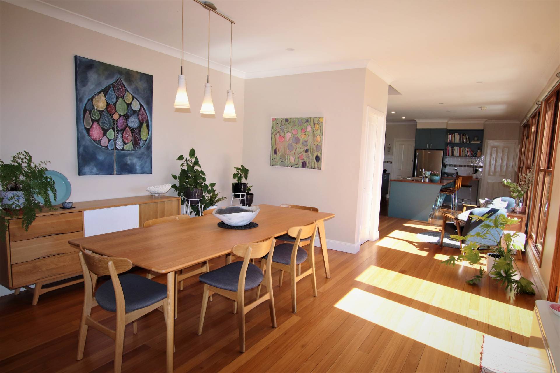 * Dining with flued gas heater, timber floors and door to north facing deck