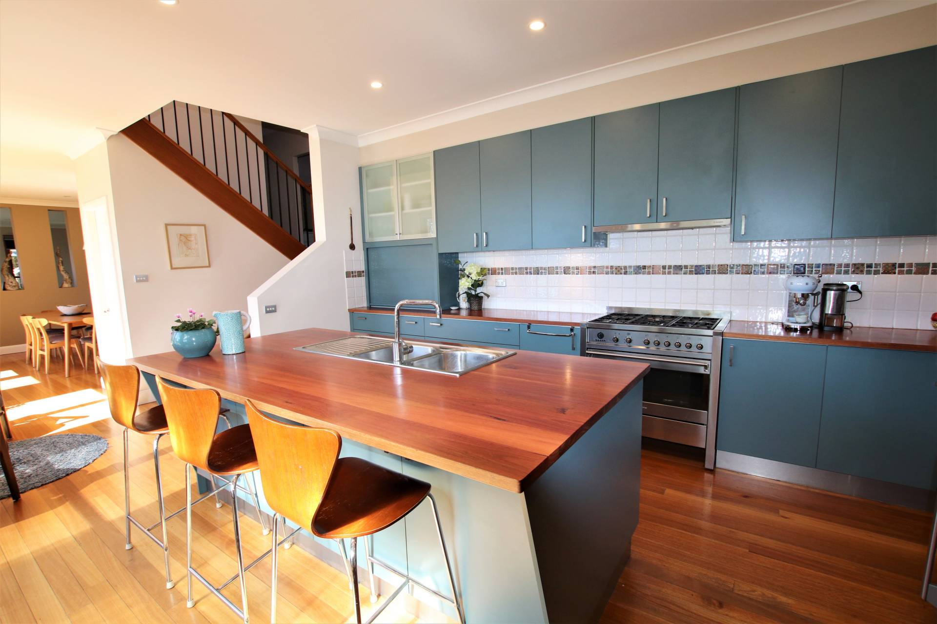* Stylish, well appointed kitchen with Smeg electric oven, 6 burner gas cooktop, dishwasher, walk-in pantry, island bench with breakfast bar, study nook and timber benchtops