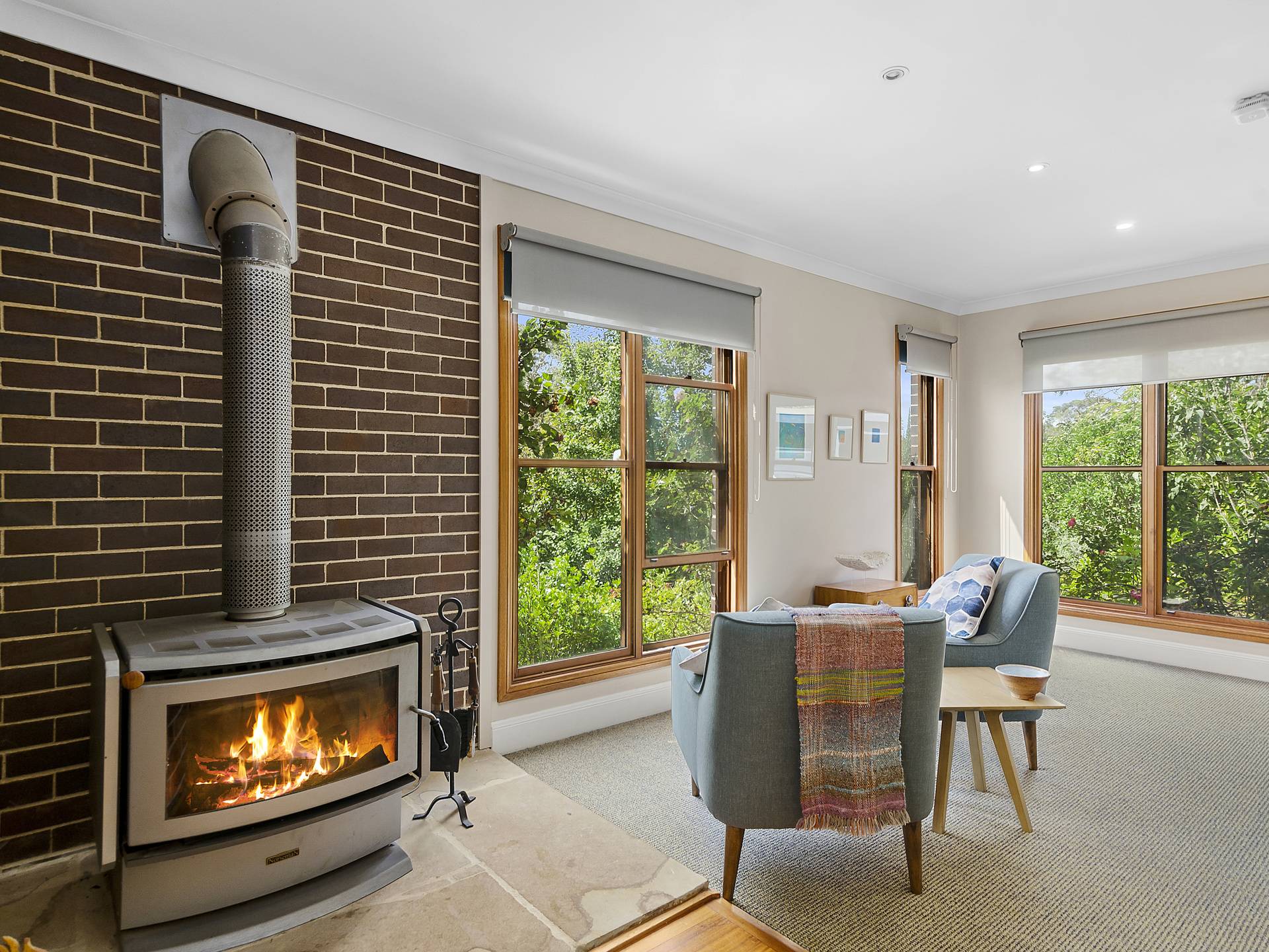 * Living room with slow combustion fire, ceiling fan and garden vistas
