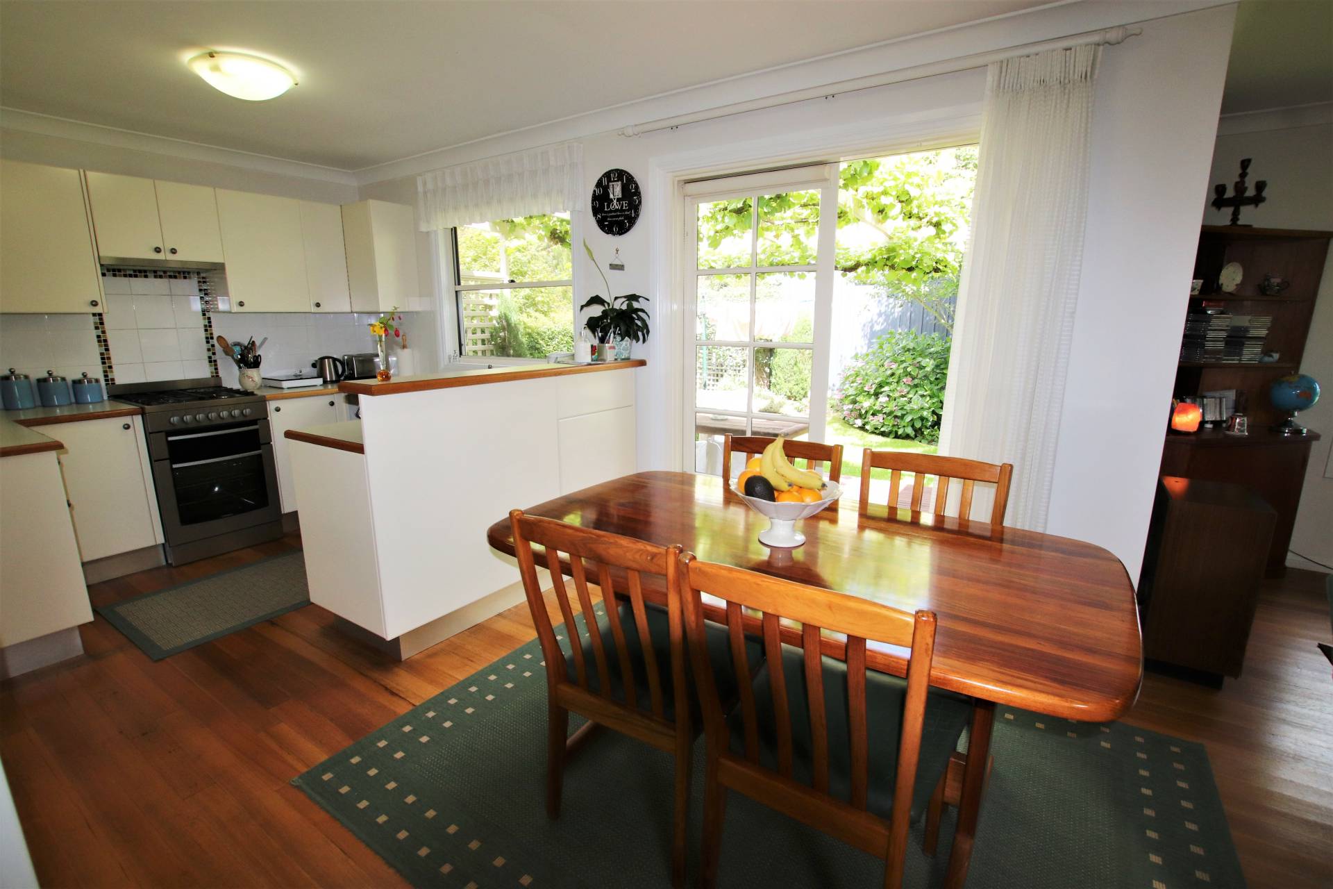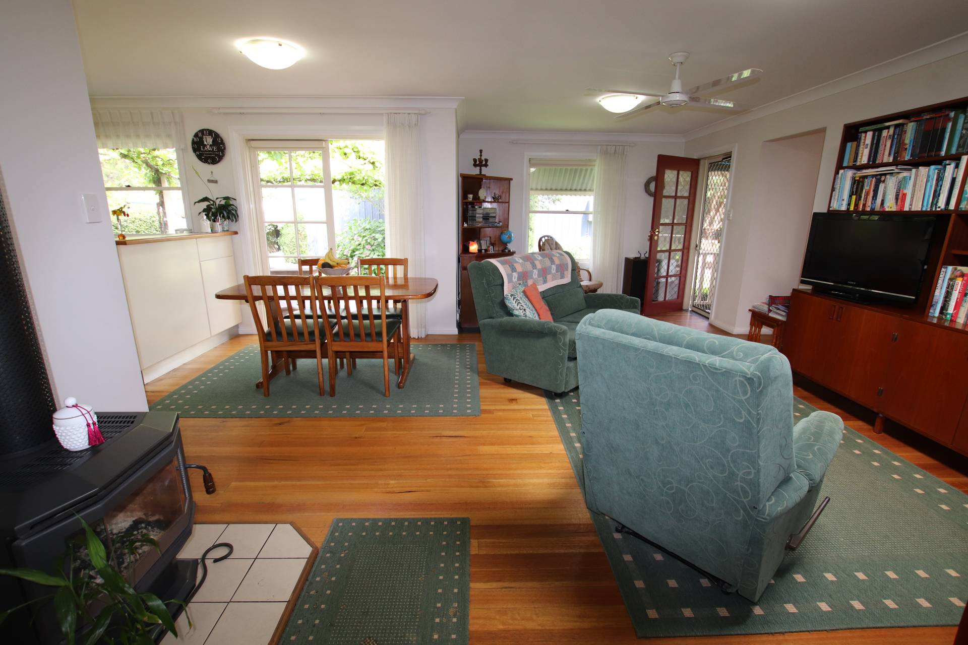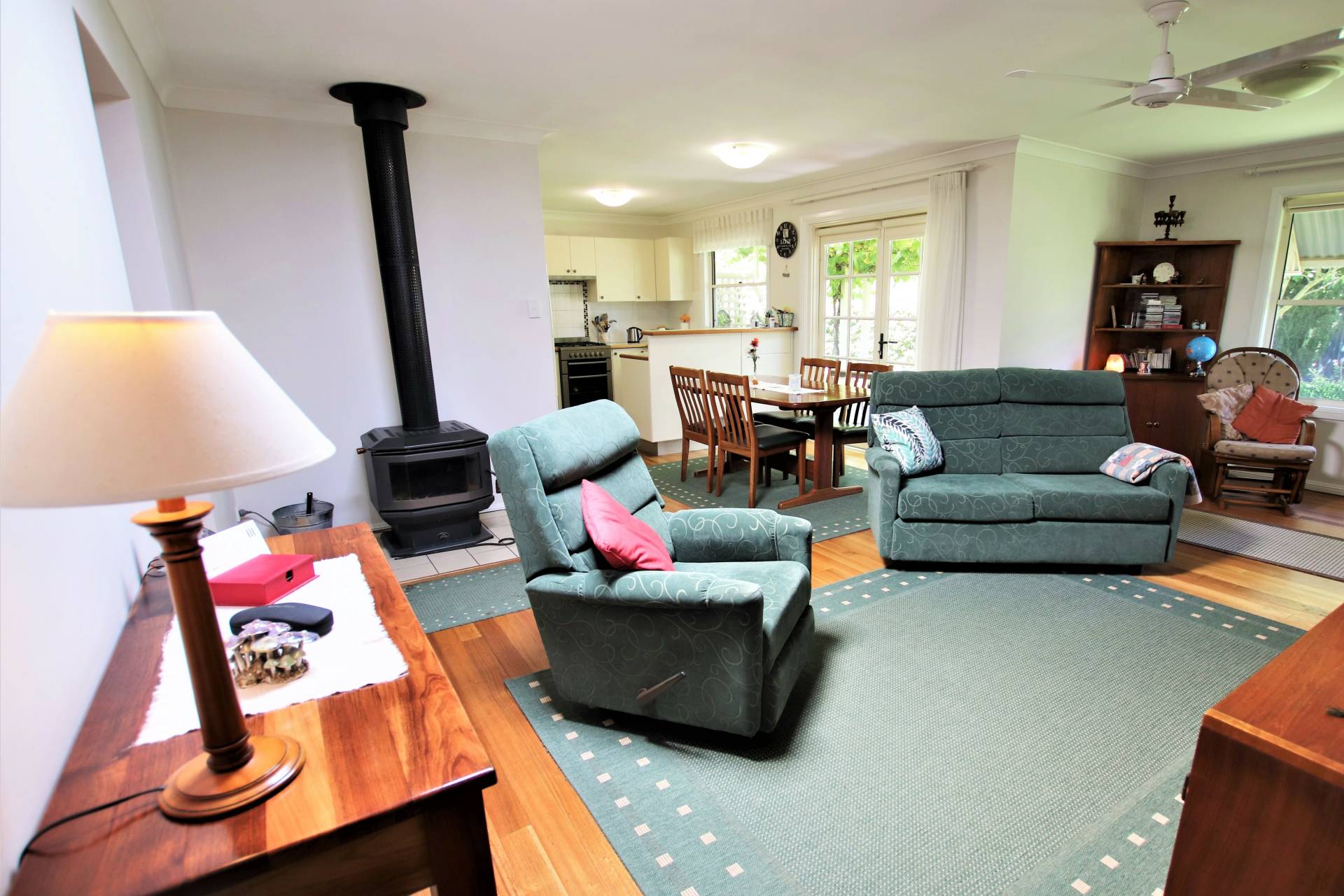 * Open plan family and dining with slow combustion fire, French doors to sunny, covered entertaining area, ceiling fan and 'Tassie Oak' timber floors
