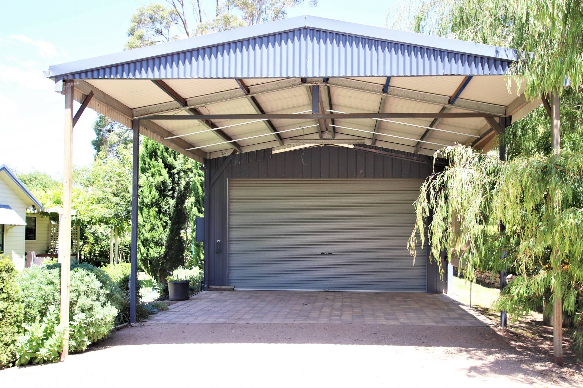 PLUS: A LARGE, STEEL FRAME GARAGE AND WORKSHOP (10M X 6M) WITH 3 PHASE POWER AND AN ADJOINING STEEL FRAME CARPORT (6M X 5M) – PERFECT FOR CARAVAN/MOTORHOME