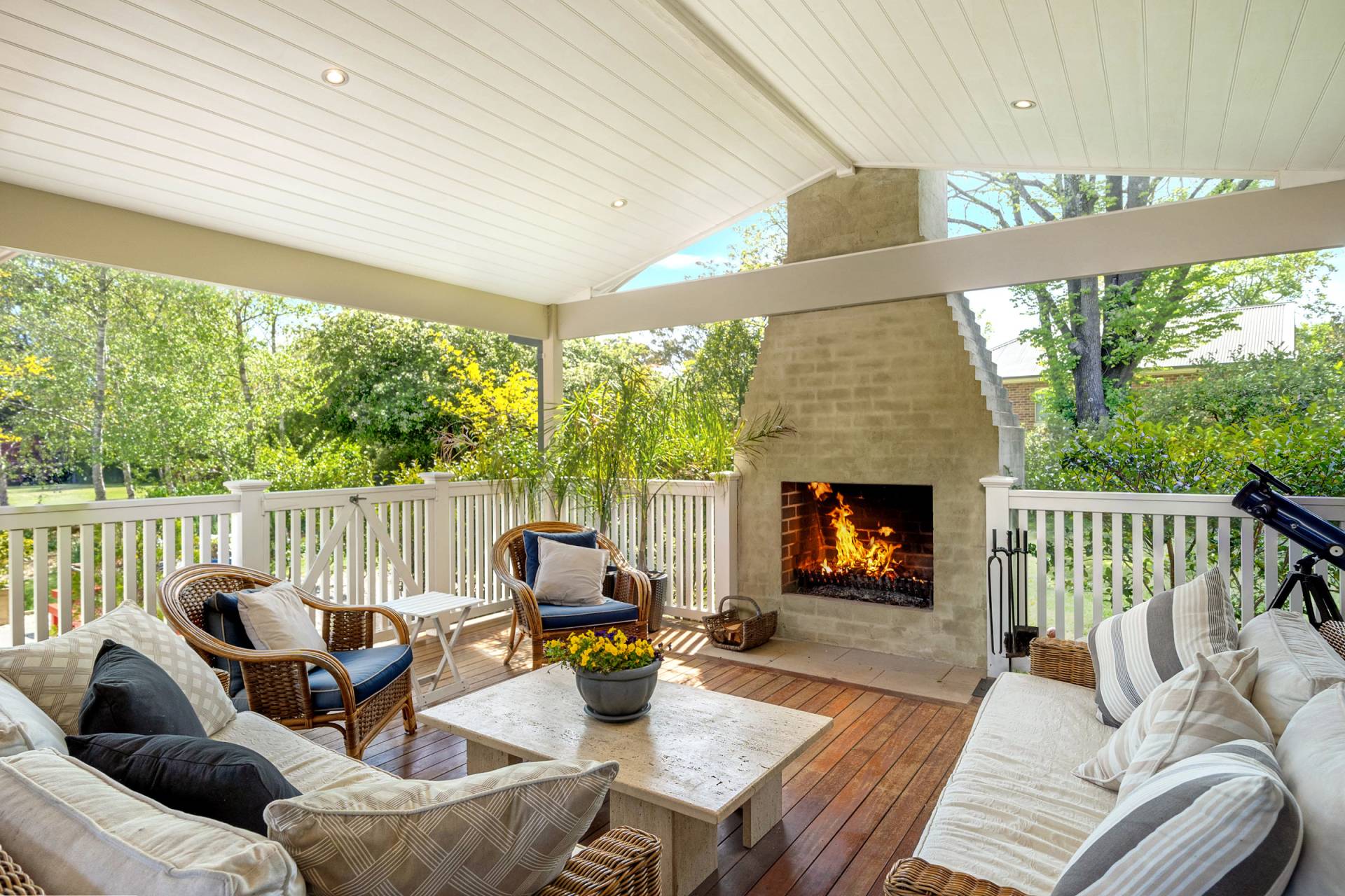 * Stunning large deck (64m2) with vaulted timber-lined ceiling and large built-in open fireplace
