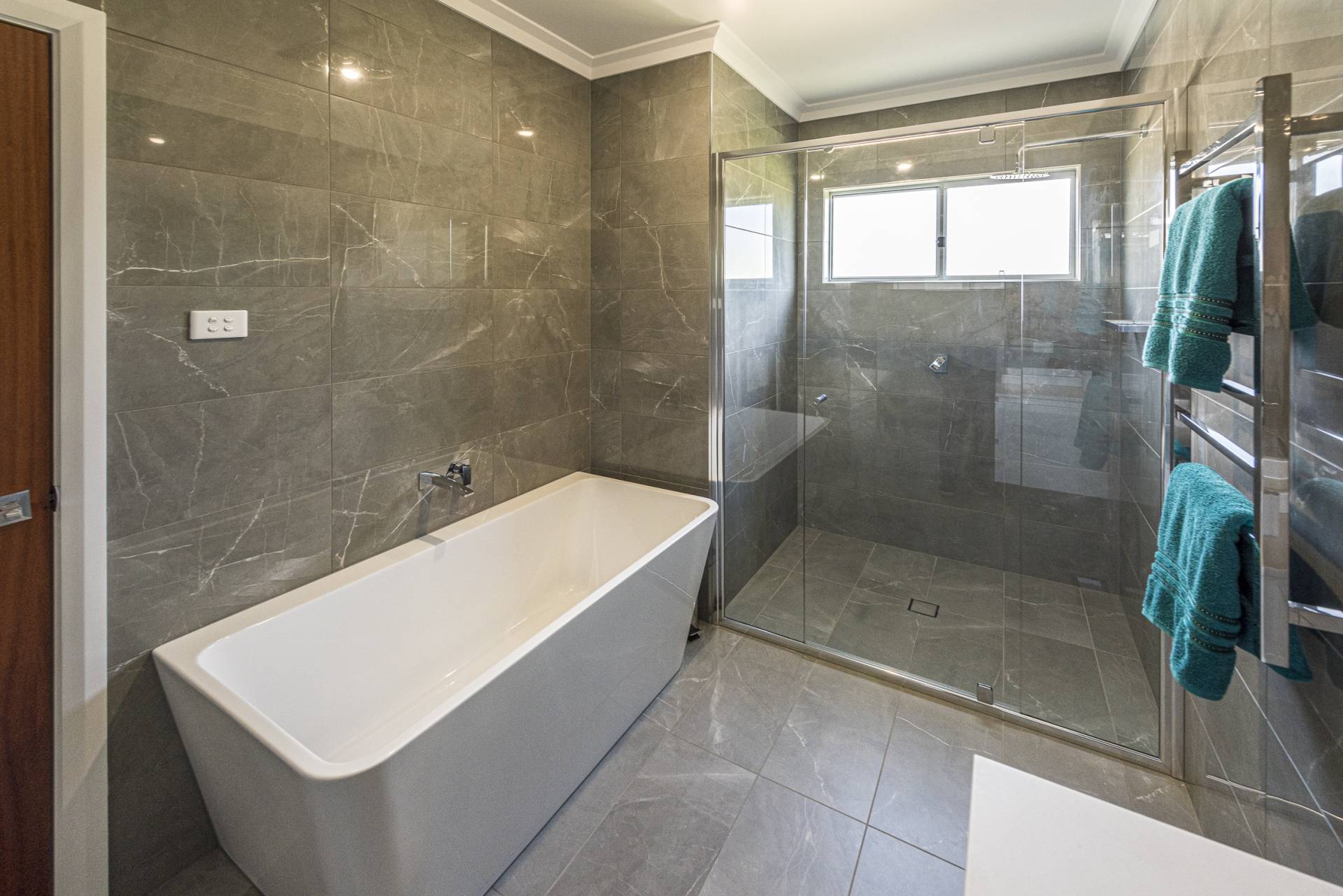 * Fully tiled main bathroom with freestanding bath, shower, lab vanity and separate w.c. / powder room with vanity