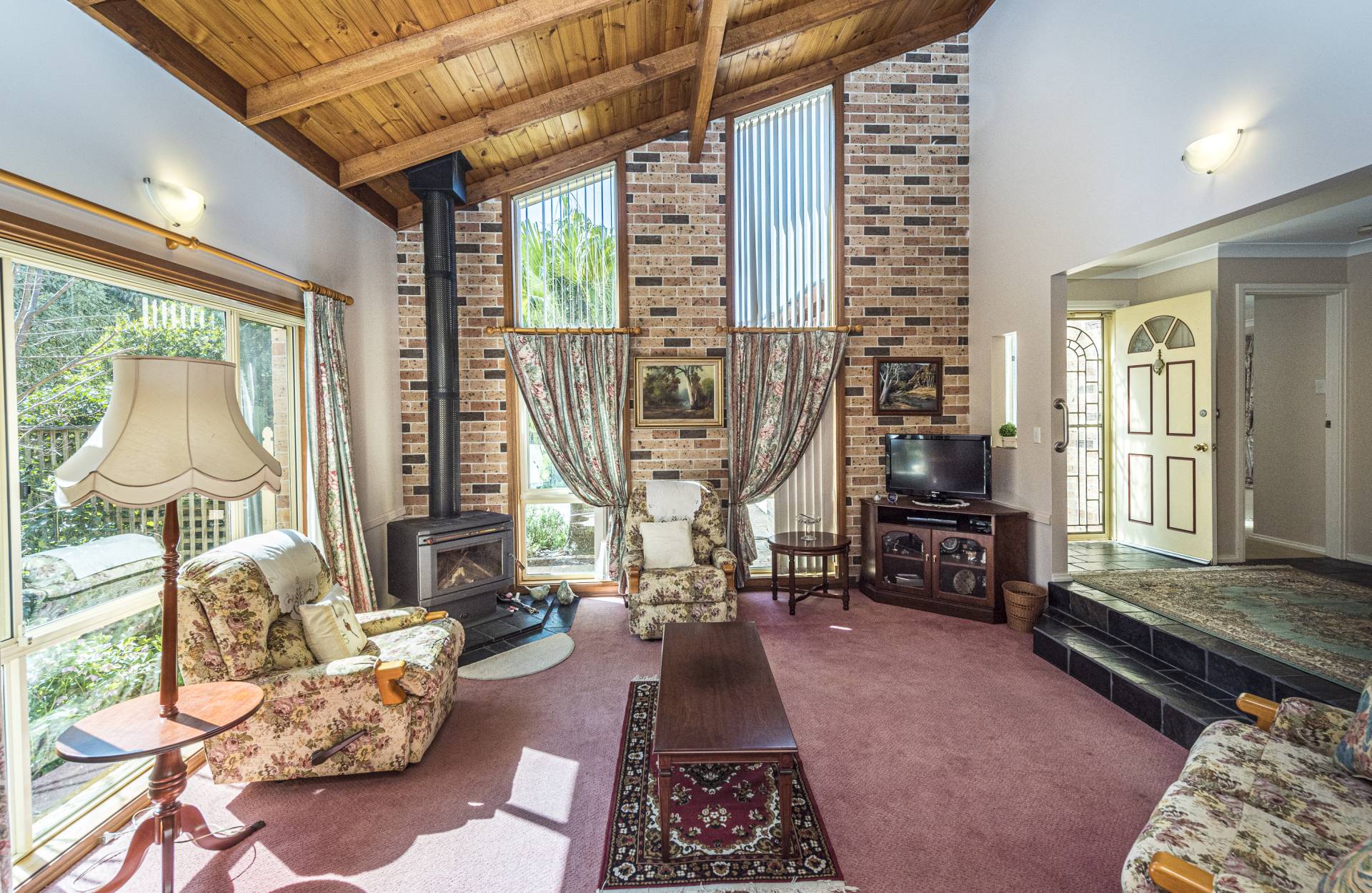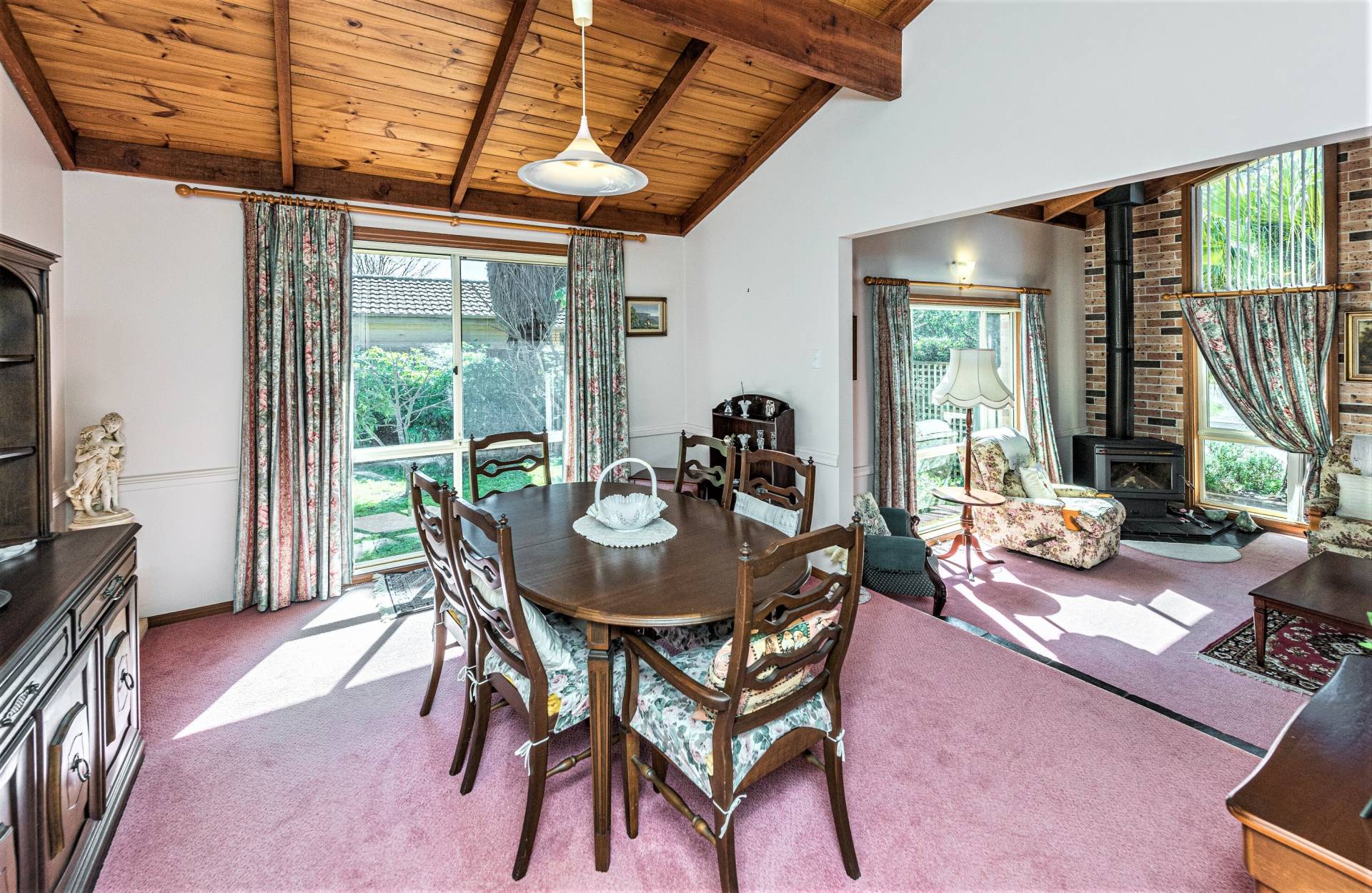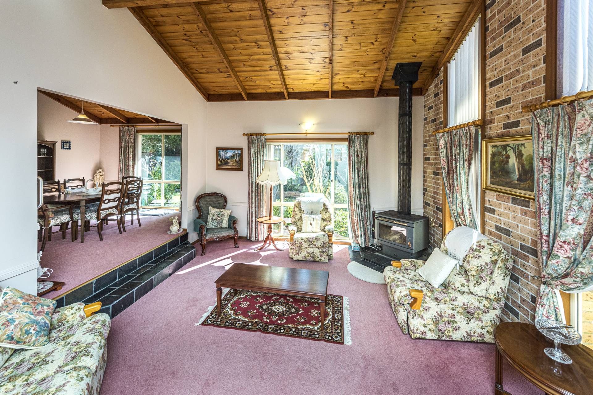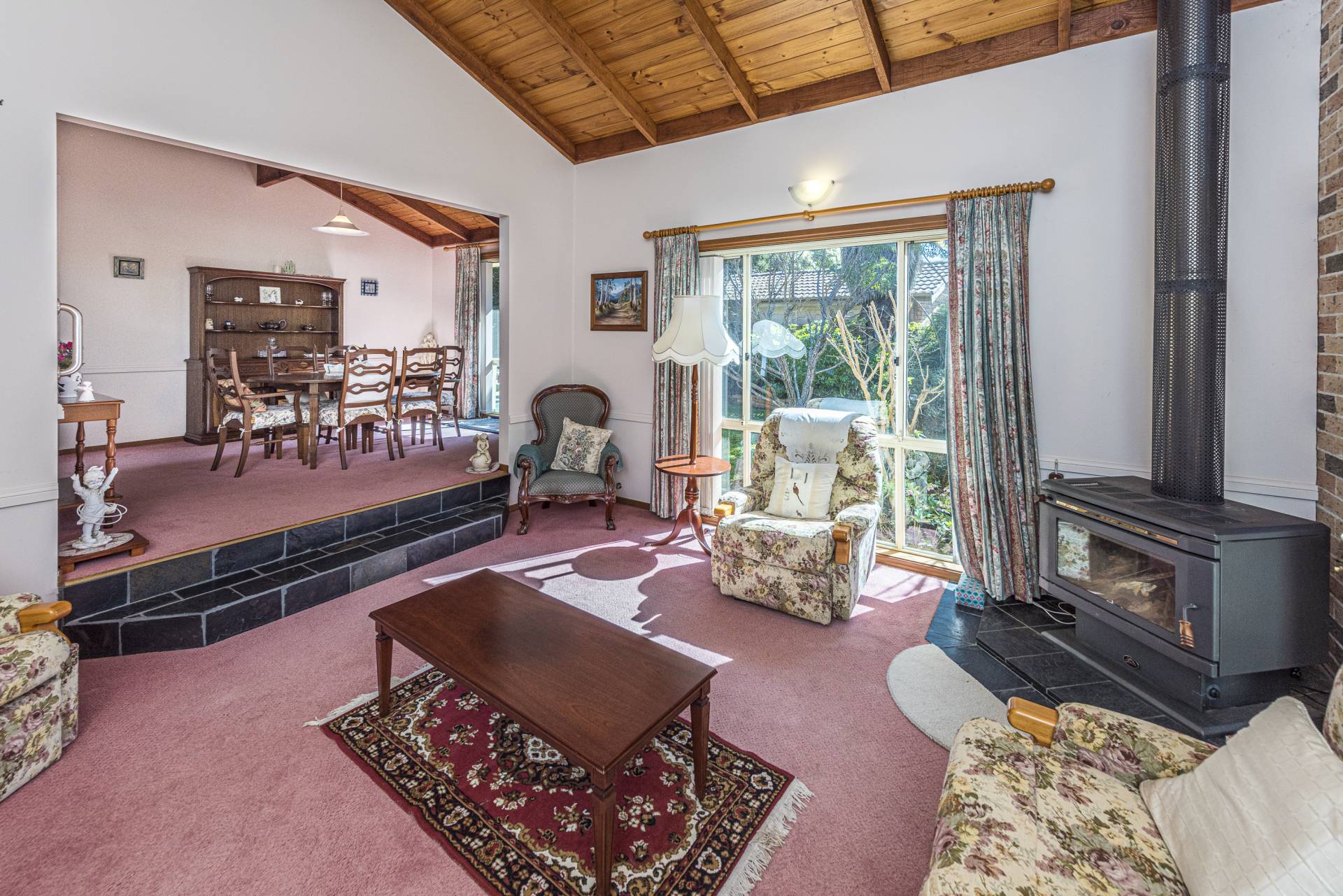 * Formal lounge and dining (split-level) with timber lined raked ceiling and a slow combustion fire
