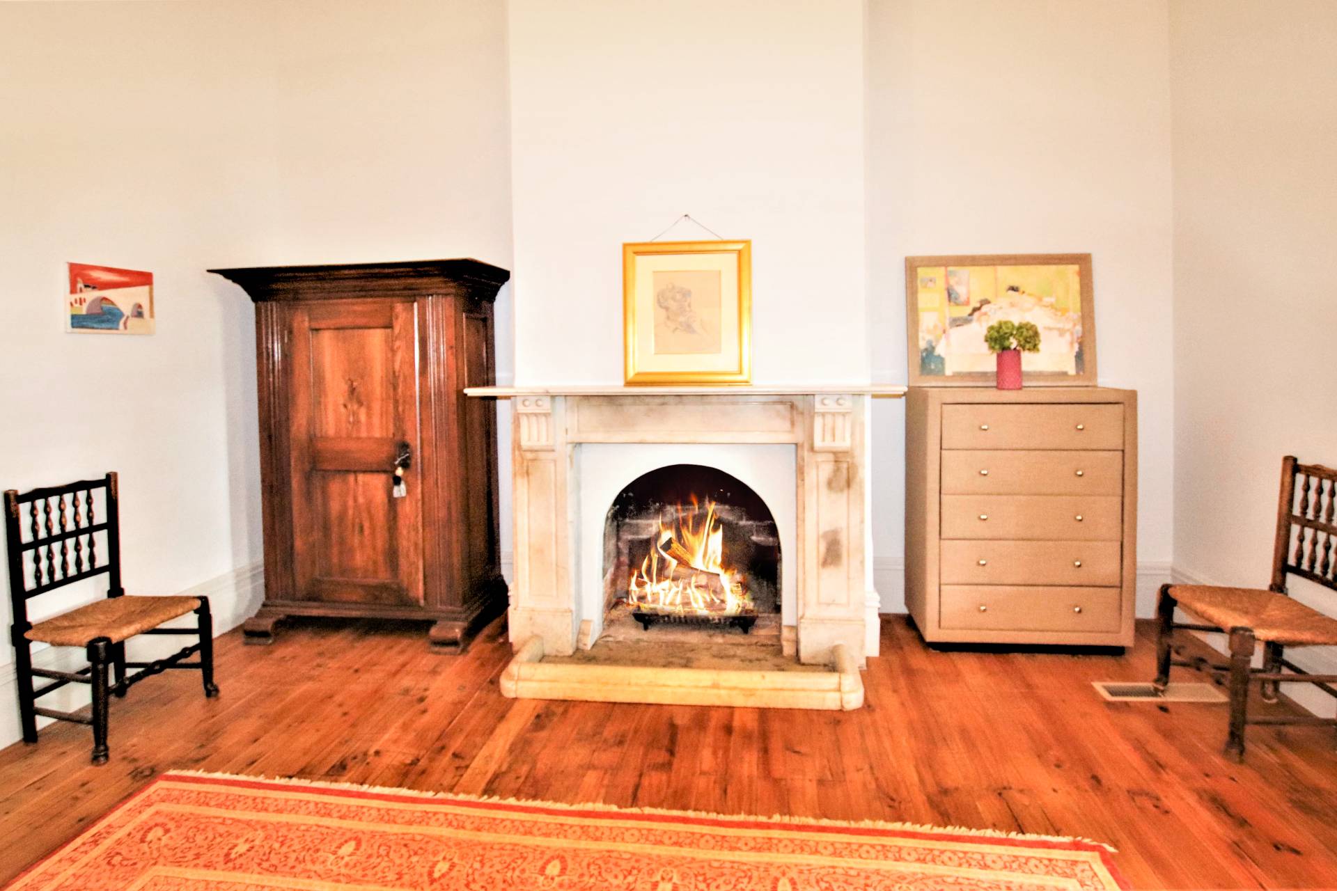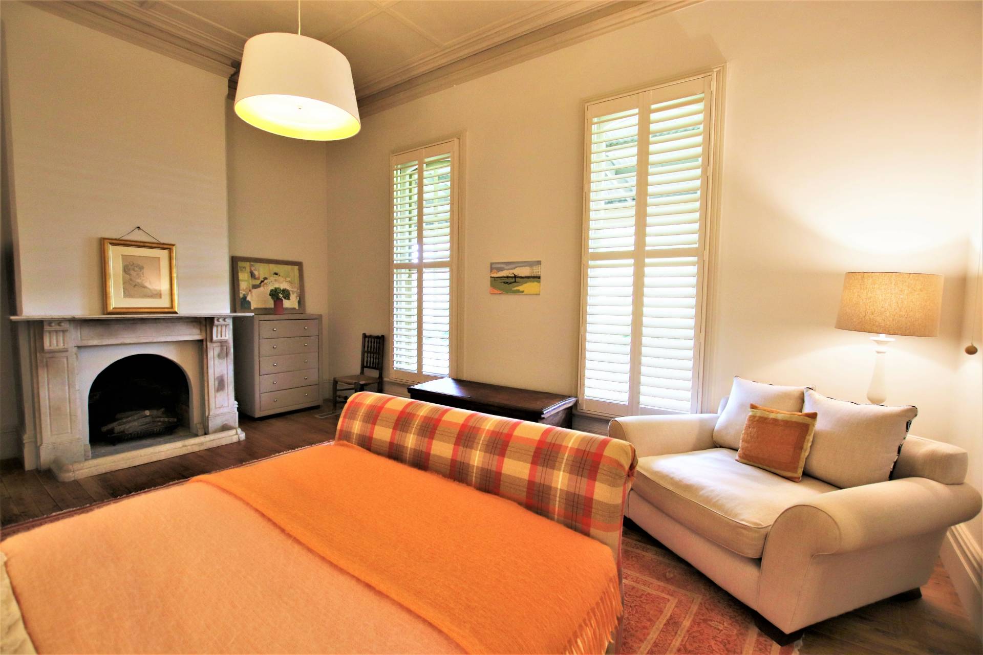 * King size main bedroom with open fire and marble surround, plantation shutters and decorative ceilings