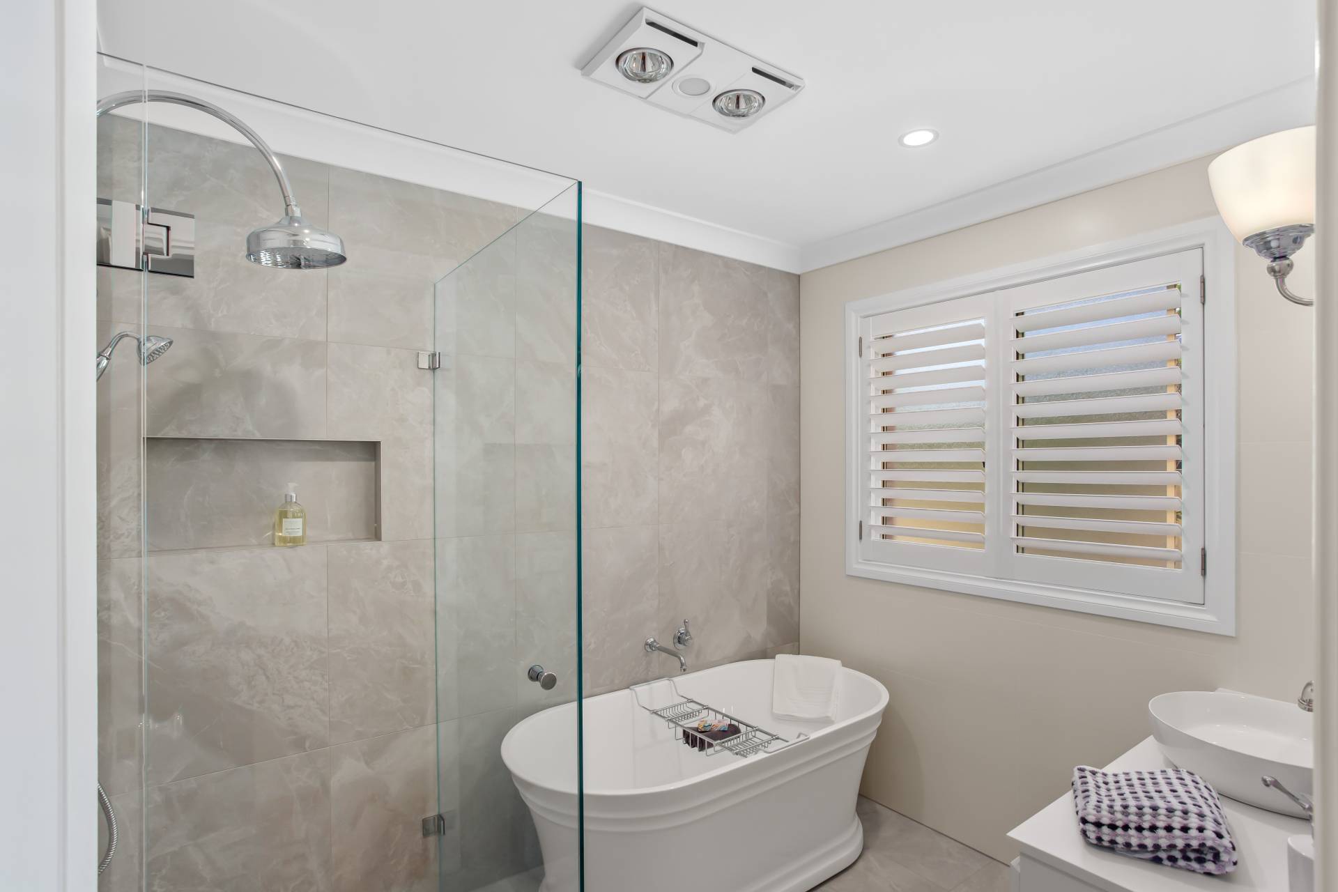 * Main bathroom fully tiled with free standing bath, frameless shower, vanity, tastic lights, plantation shutters & a separate w.c.