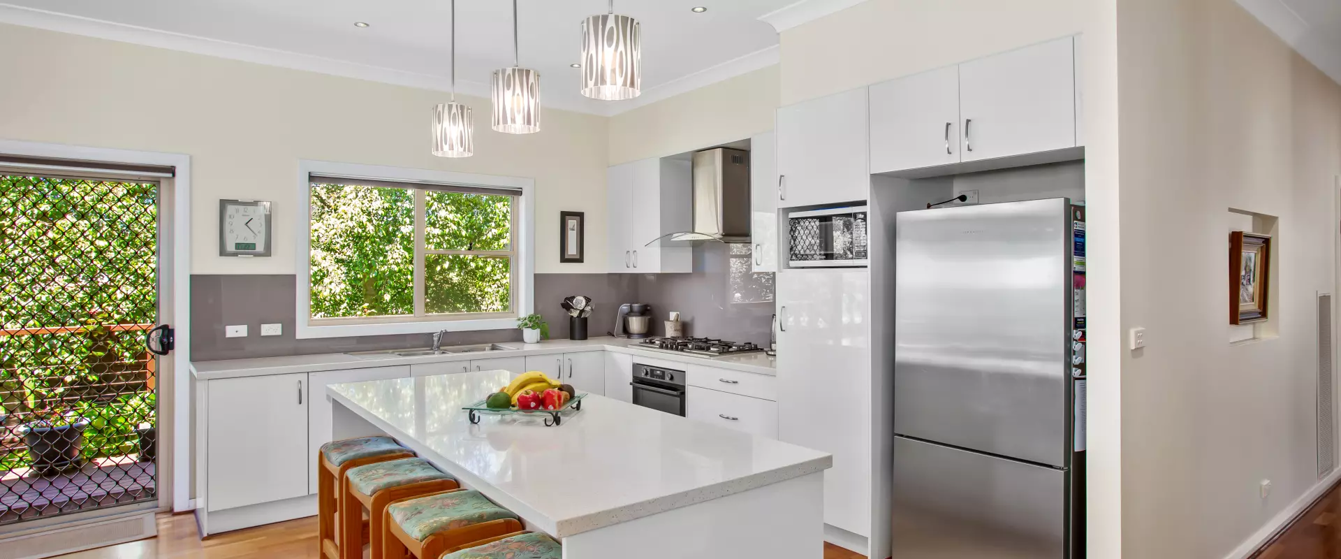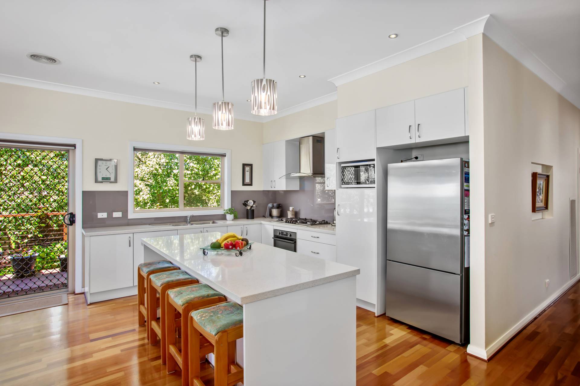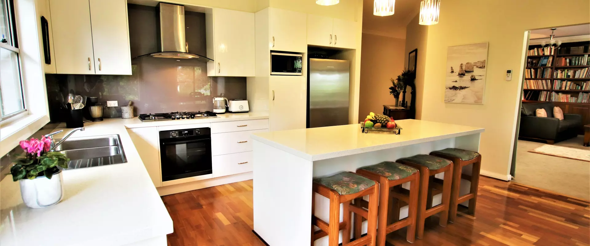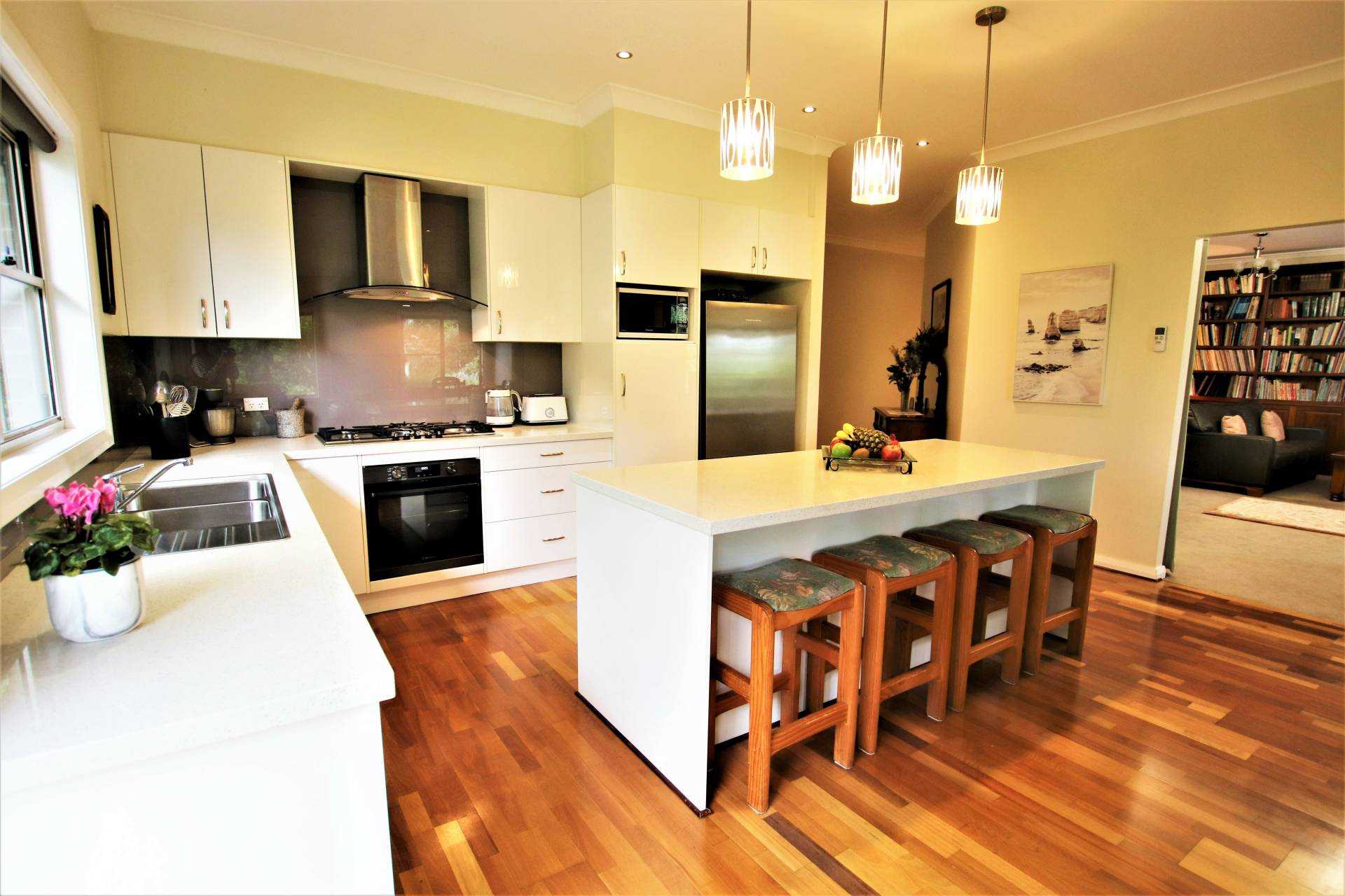 * Stylish and well- appointed kitchen with electric ovens x 2, gas cooktop, stainless steel flue, Asko dishwasher, 40ml stone benchtops, Island bench with breakfast bar ample storage and a  Butler’s pantry