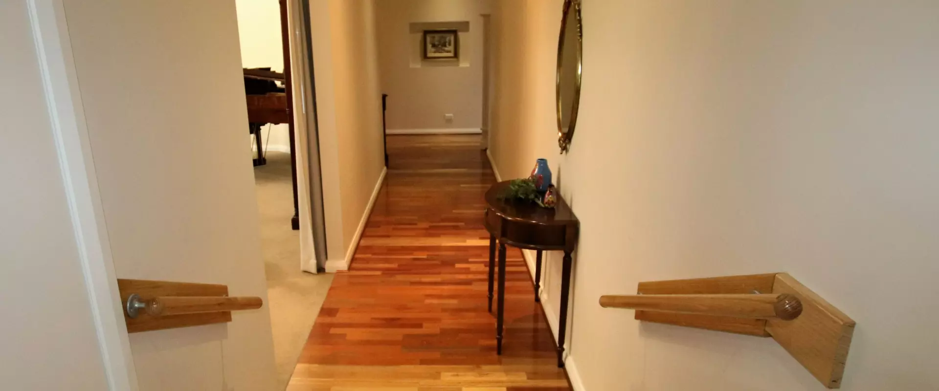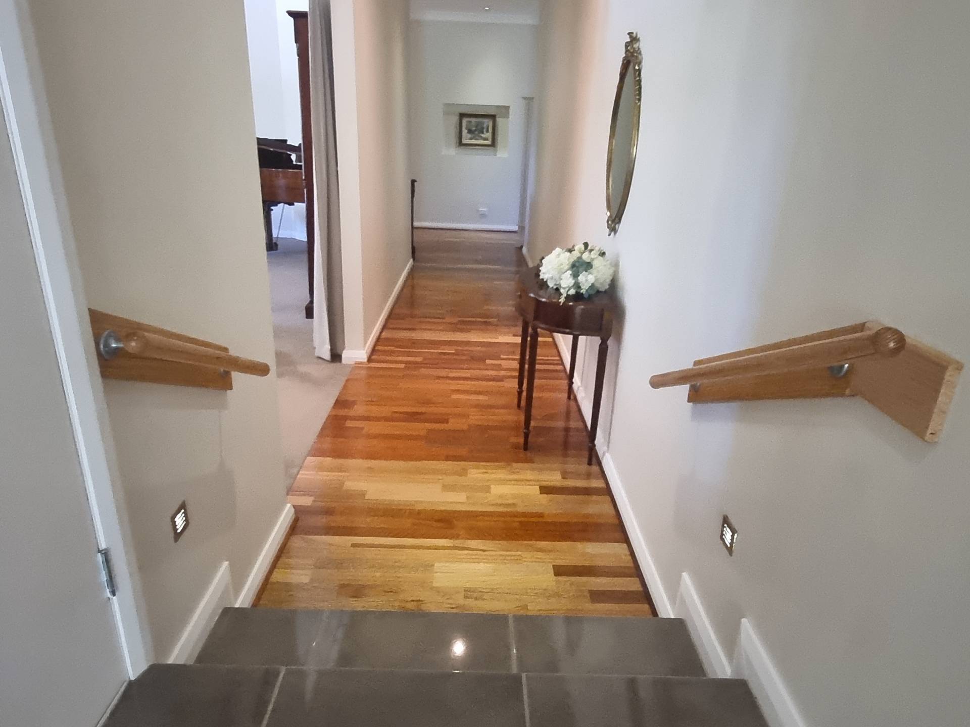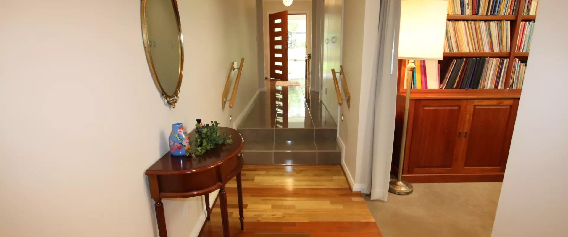 * Split-level hallway with ‘spotted gum’ timber flooring and storage