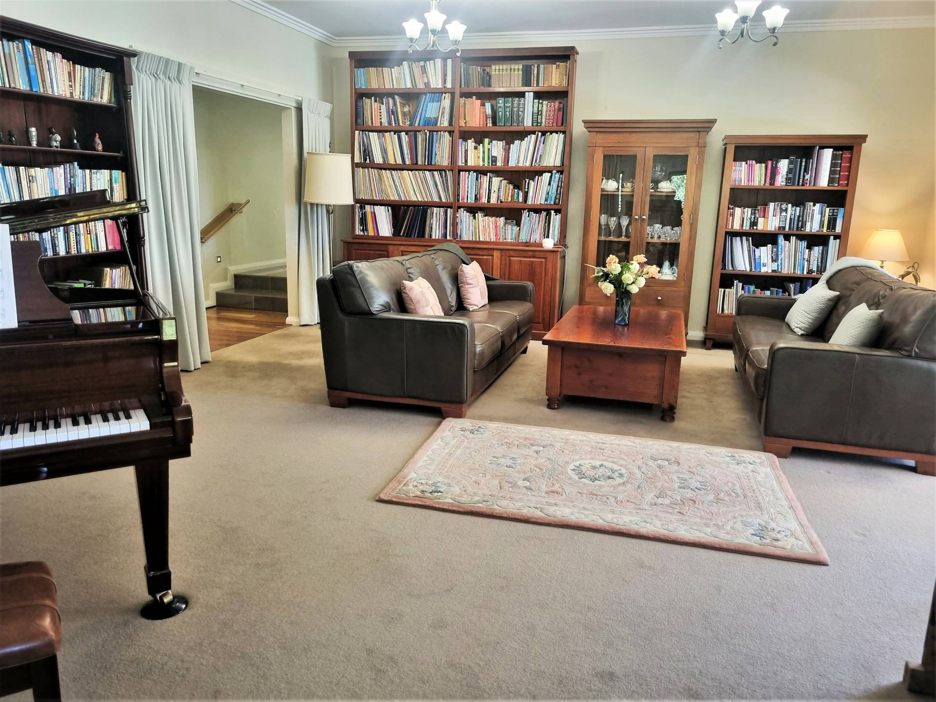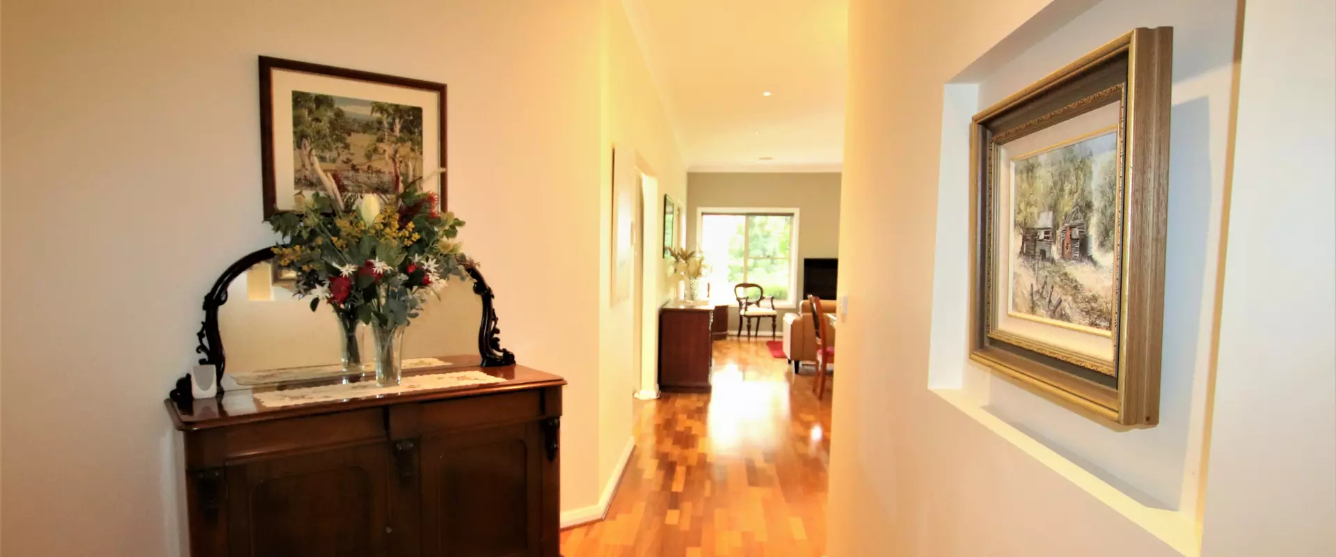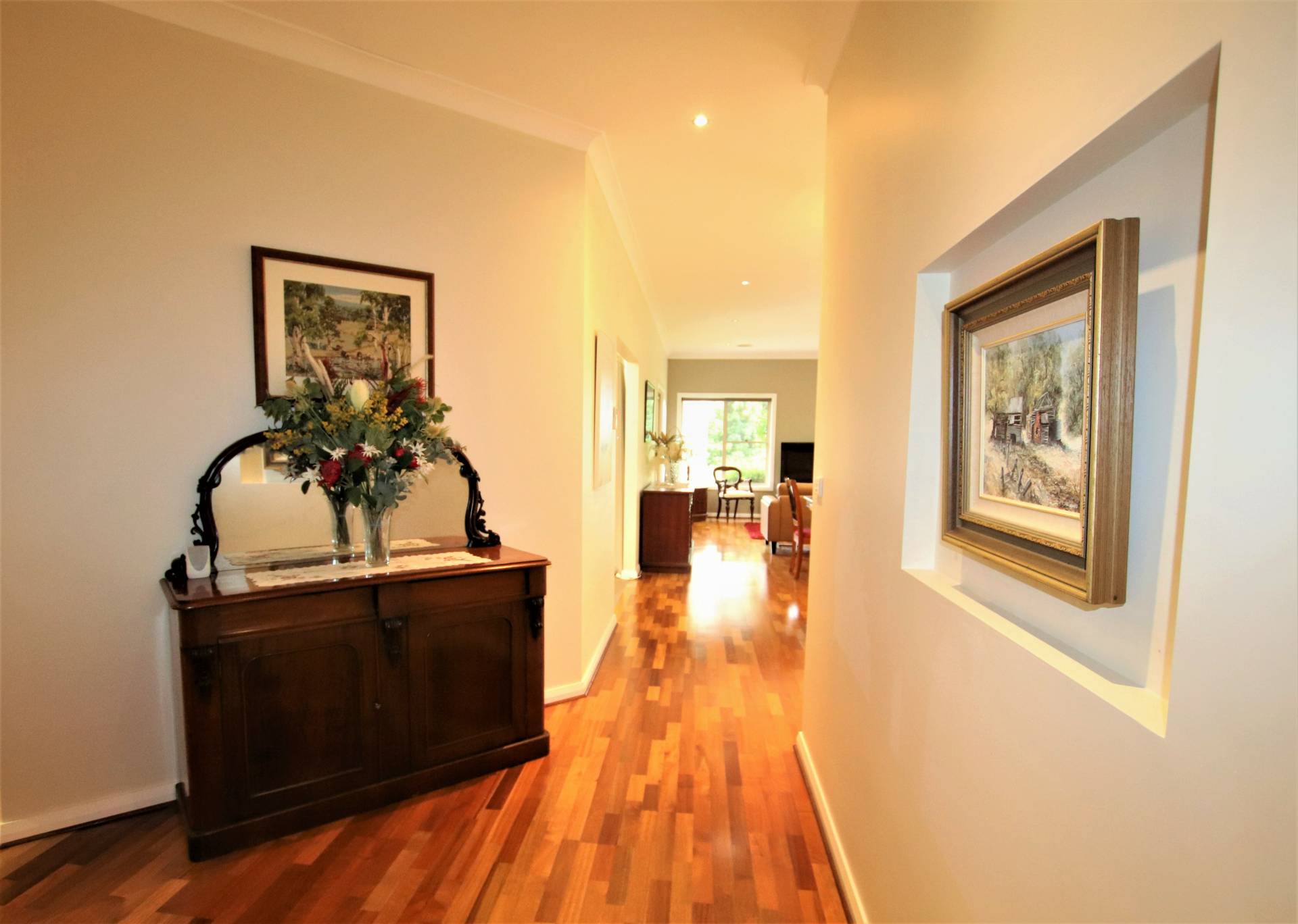* Split-level hallway with ‘spotted gum’ timber flooring and storage