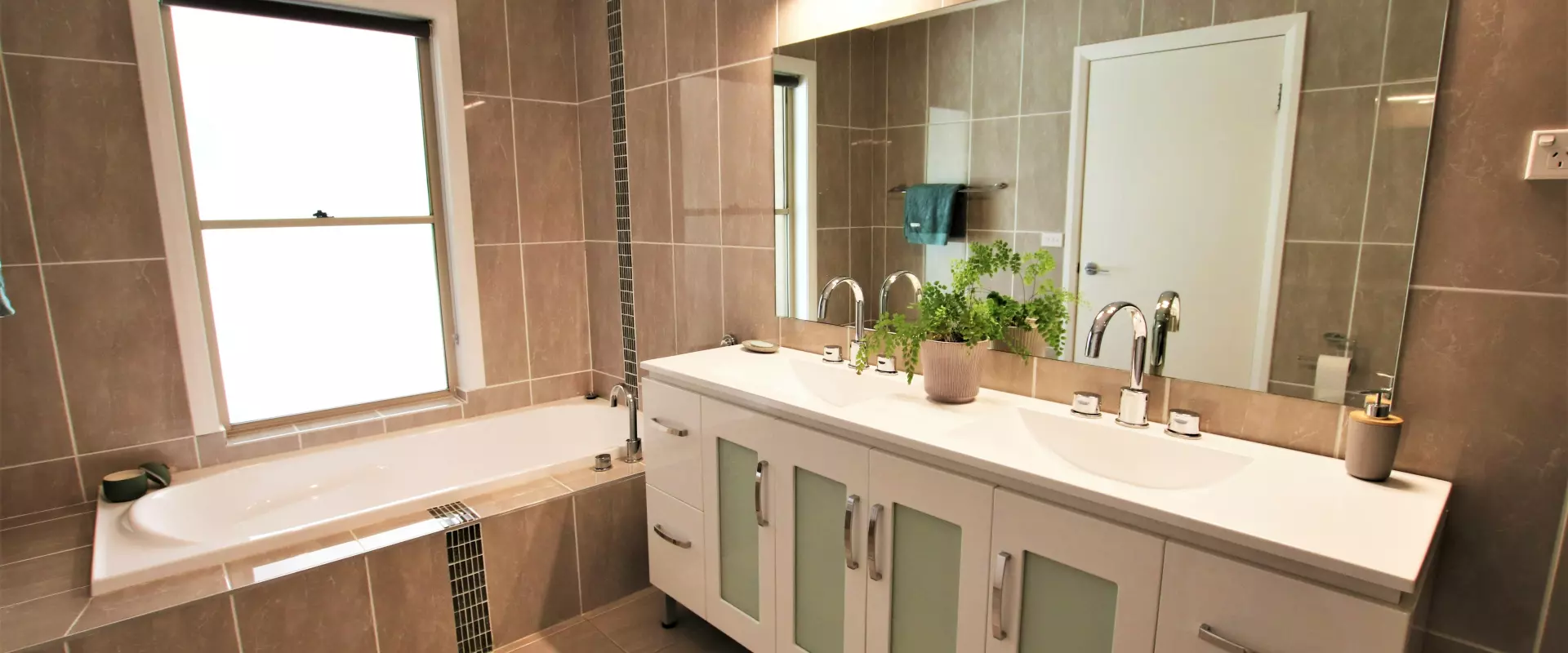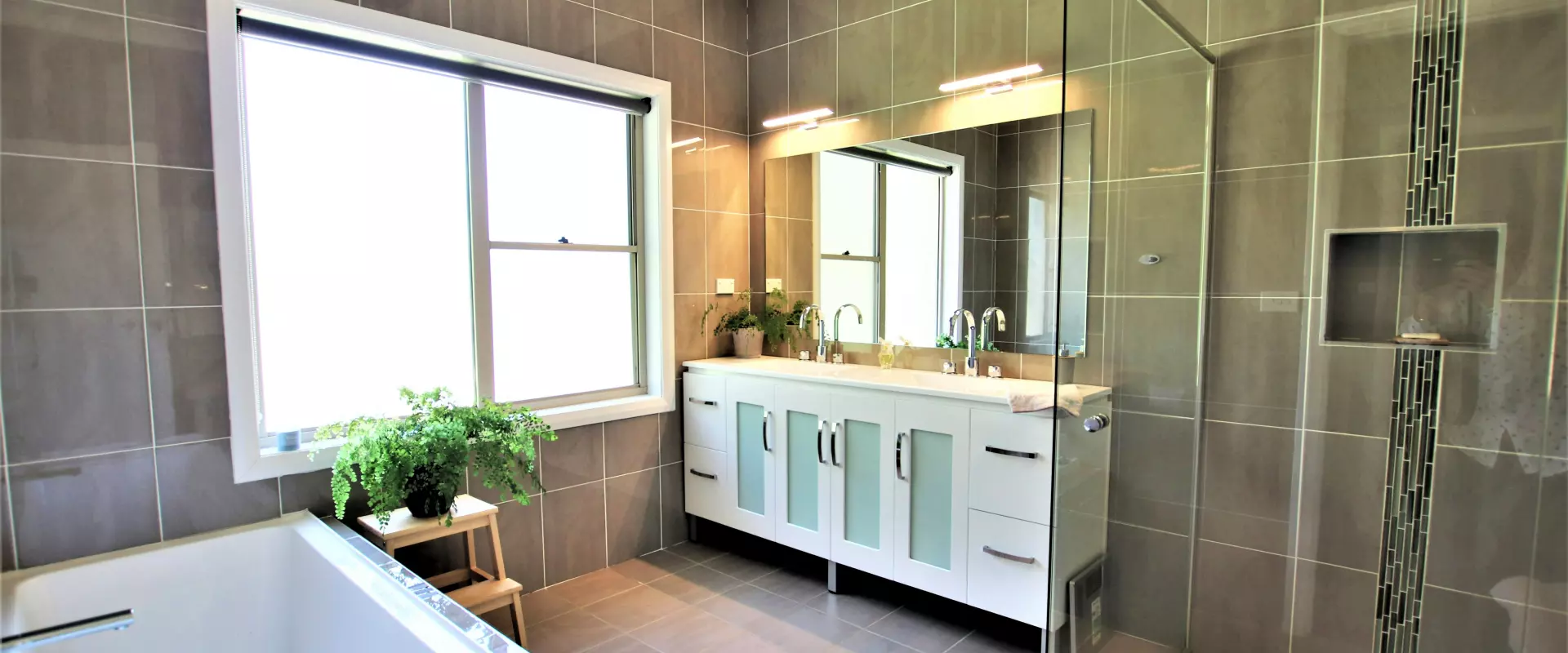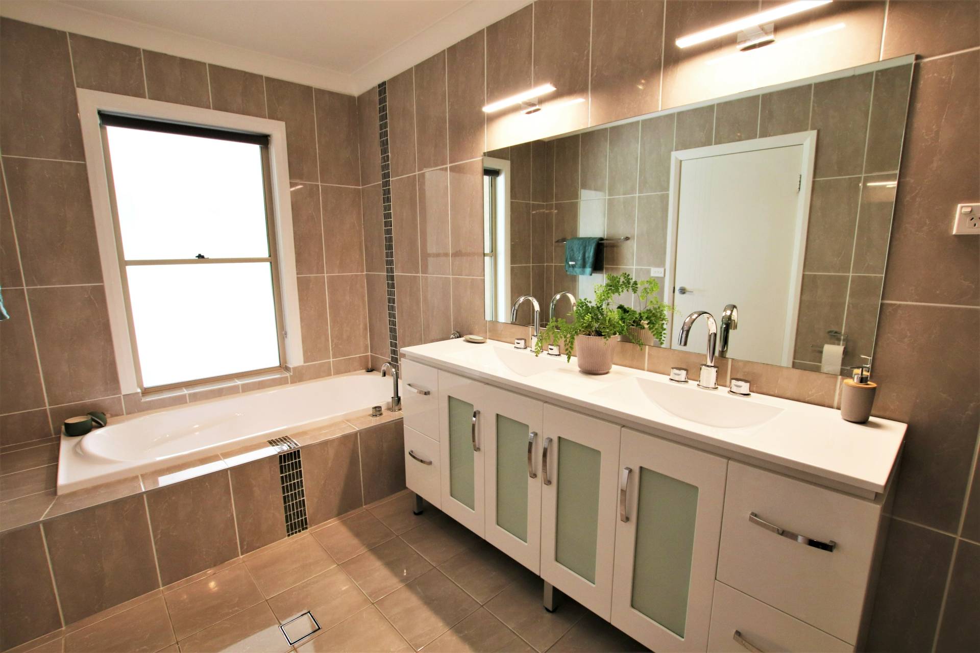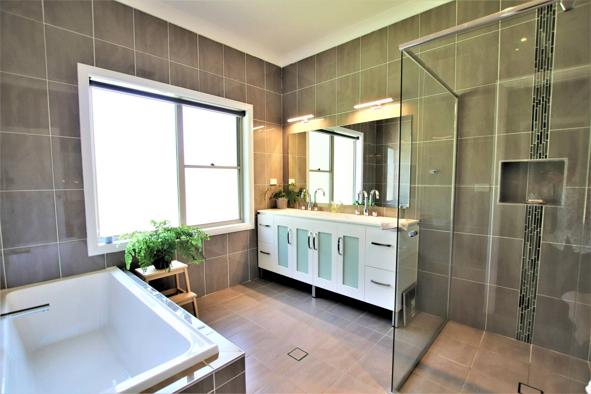 * Main bathroom (fully-tiled) with deep bath, double vanity and frameless shower
