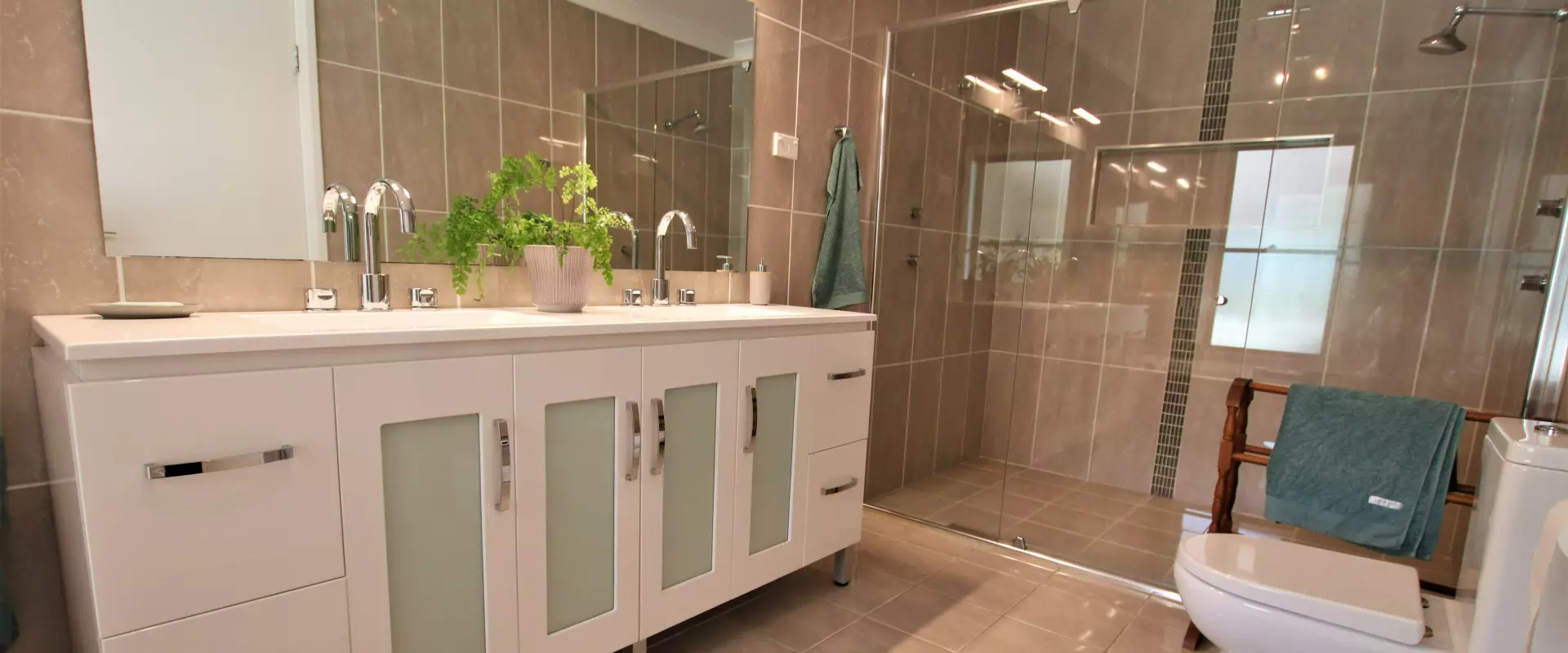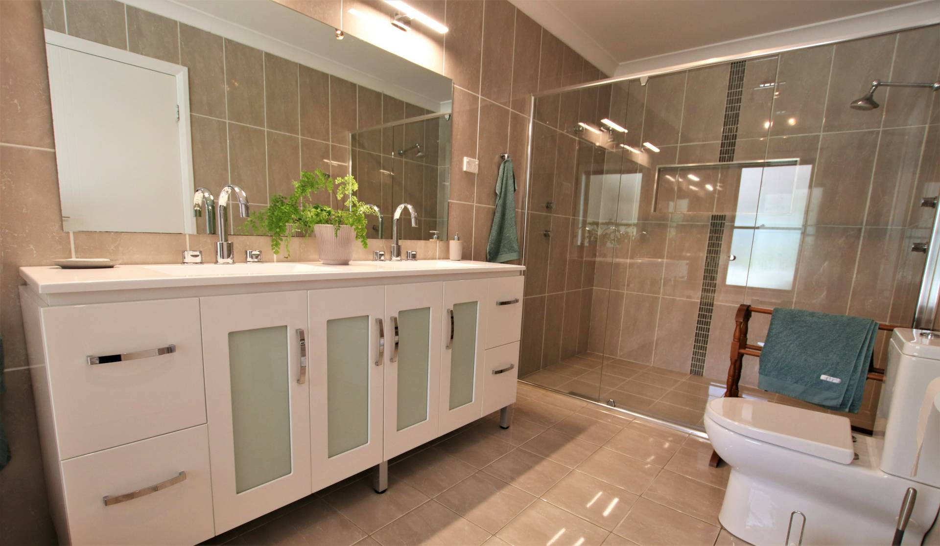 * Ensuite (fully-tiled), deep bath, double vanity, double frameless shower & w.c.