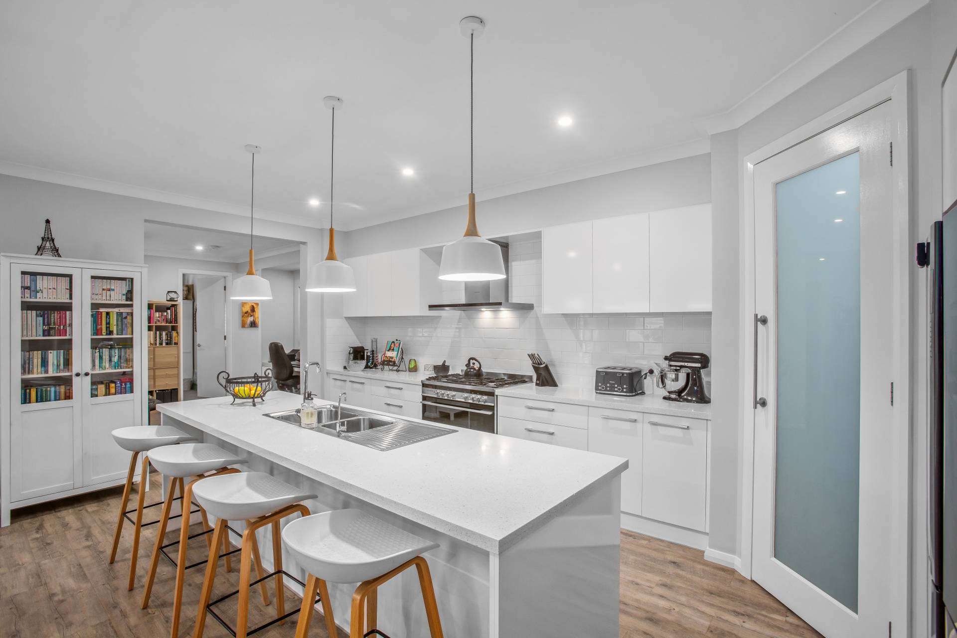 * State-of-the-art kitchen with 900mm electric oven, 5 burner gas cooktop, stainless steel flue, stone benchtop (40mm thick), island bench, with breakfast bar, filtered water, walk-in pantry and good storage