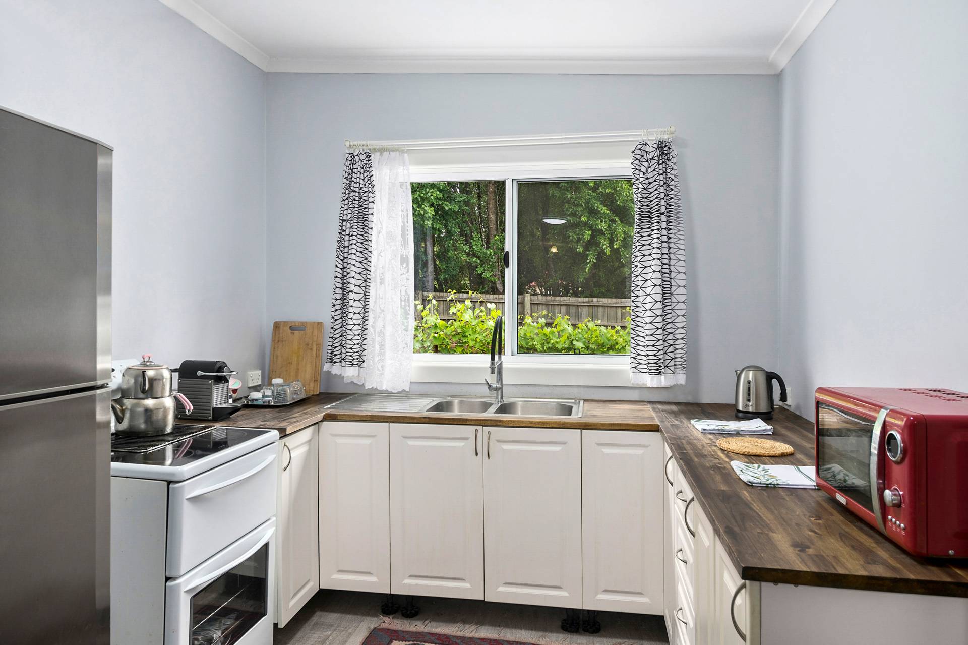 * Compact kitchen with an electric upright cooker, timber benchtops and a large pantry