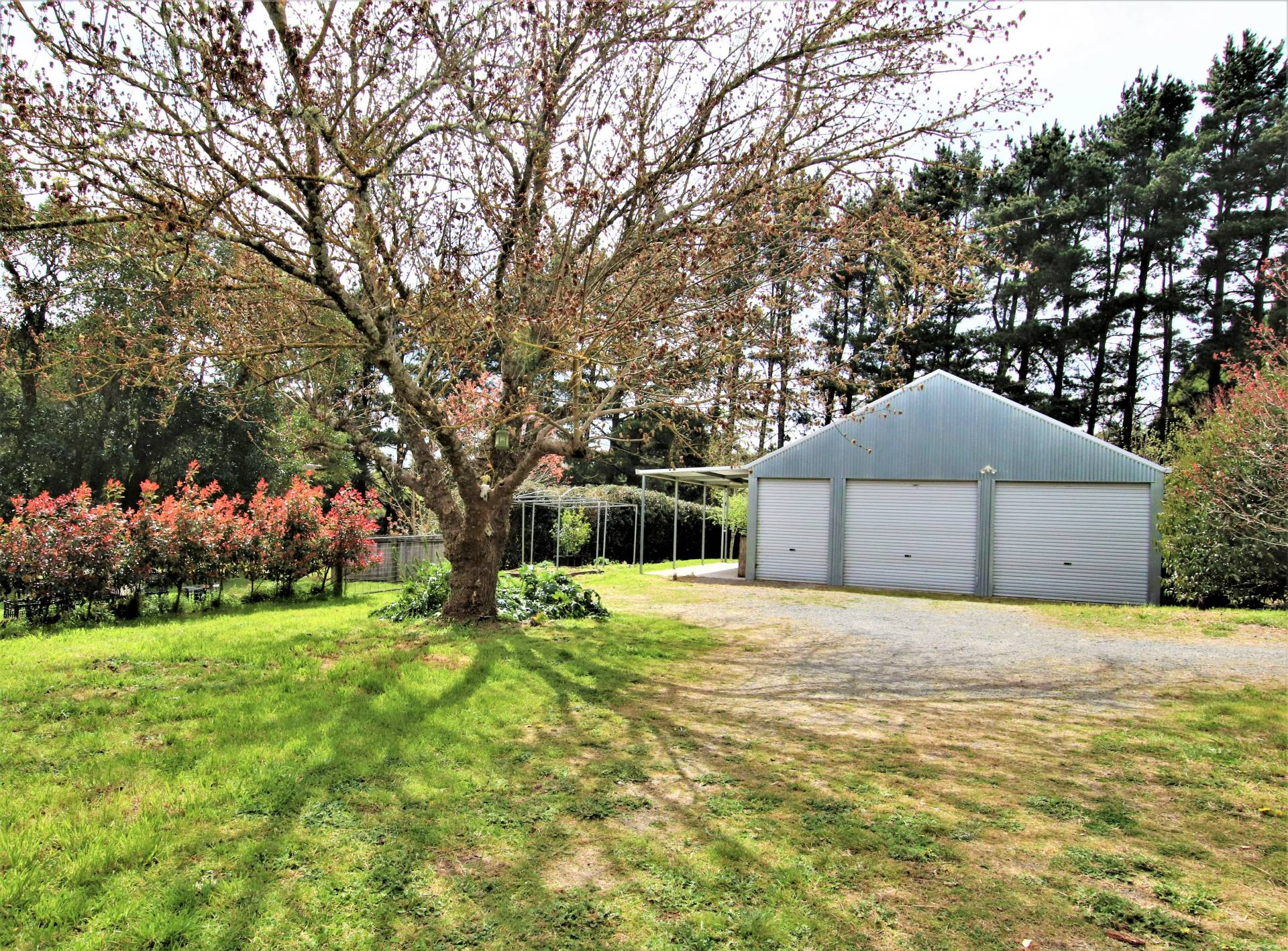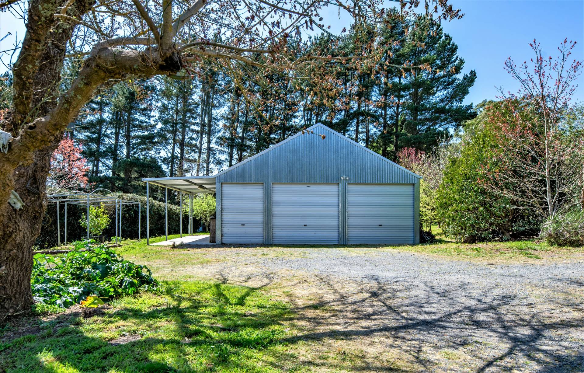 * 4 bay steel framed barn-style garage/workshop with solar power