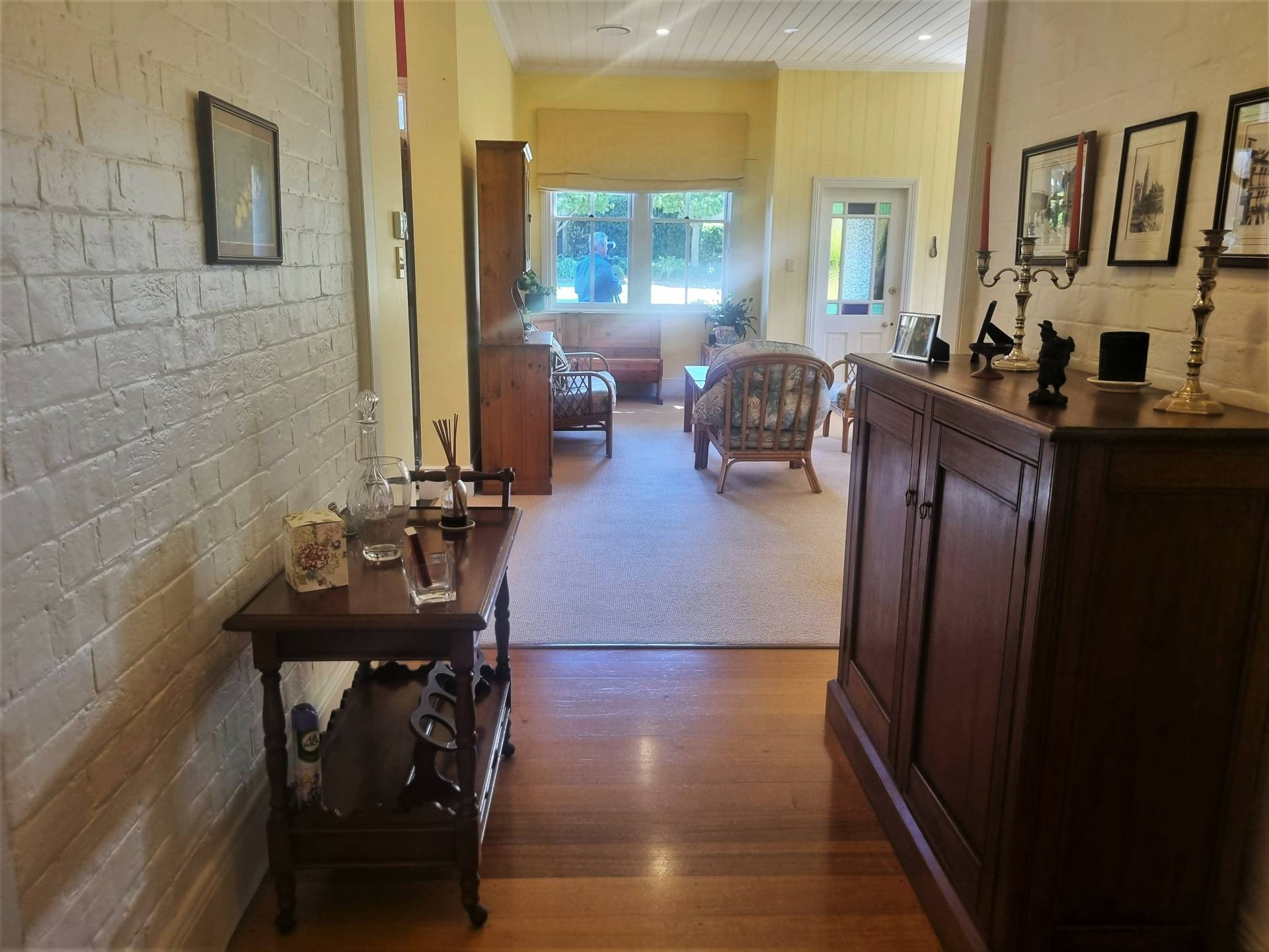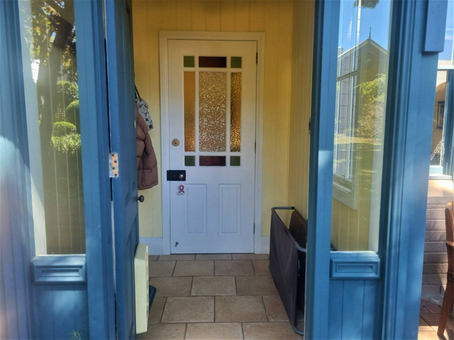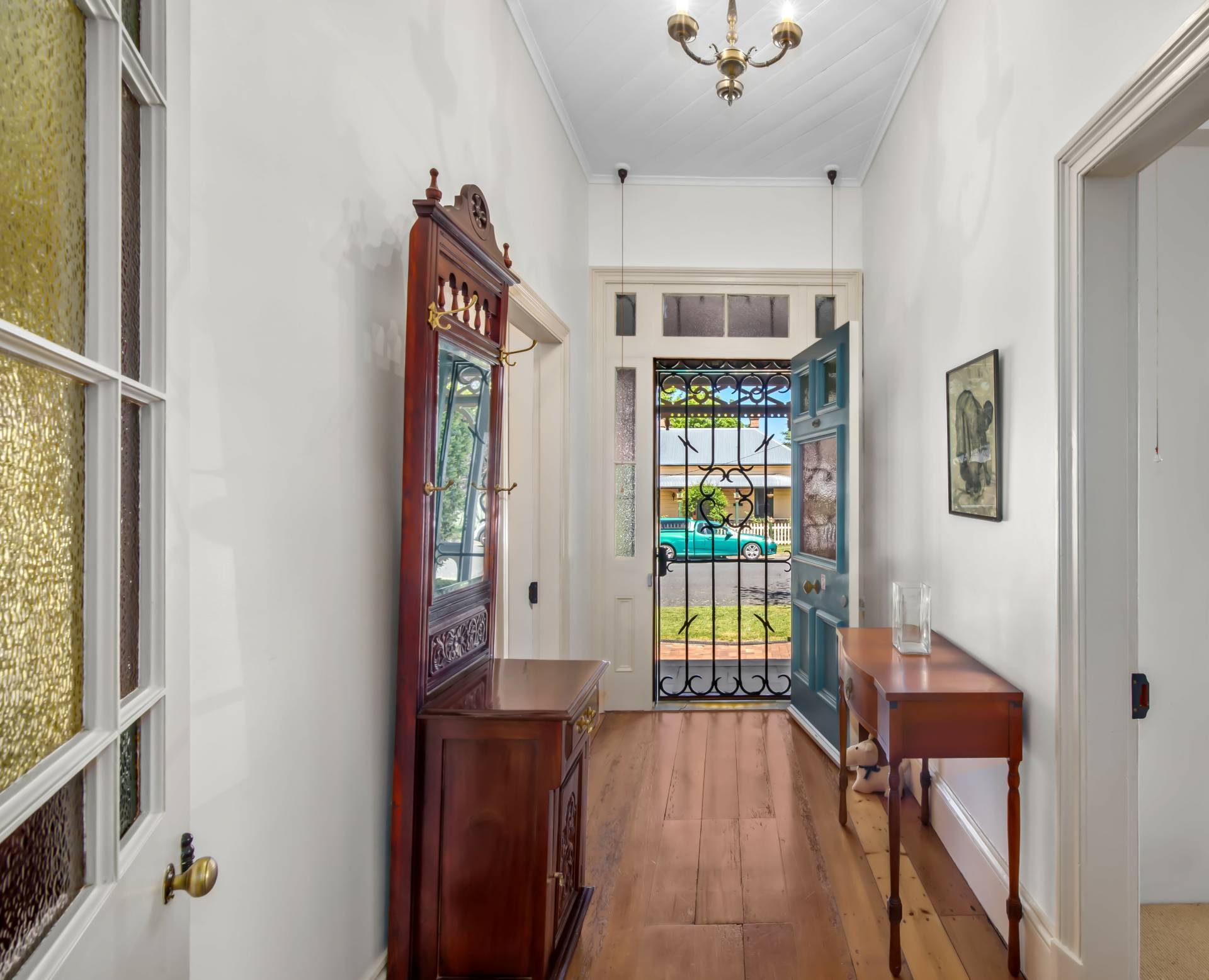 * Entry from front verandah into hallway with Kauri timber flooring and a vestibule coloured glass door