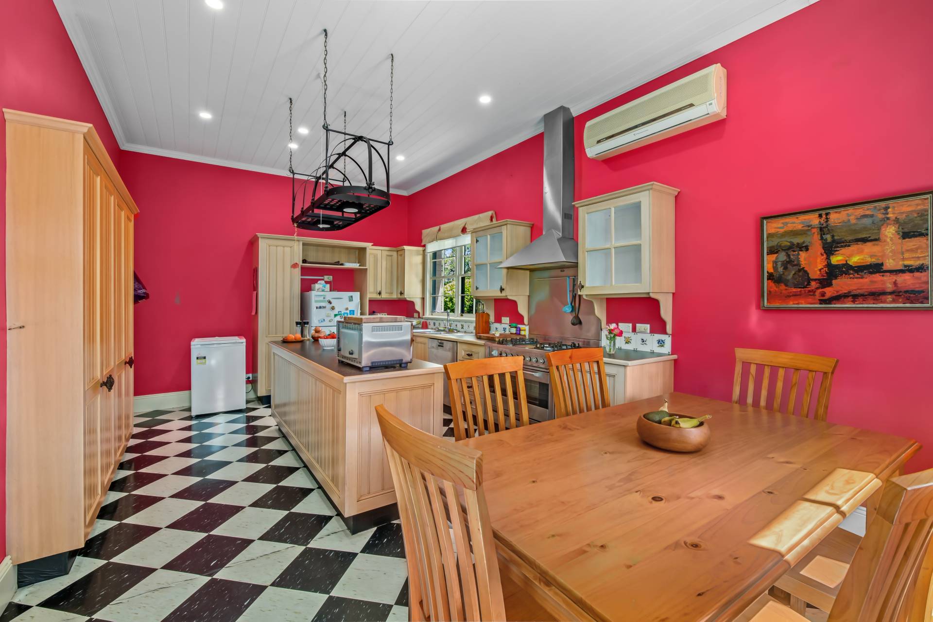 Country style timber kitchen with Ilve 900m electric cooker, 4 gas burners & 1 electric, stainless-steel flue, Miele dishwasher, island bench, plenty of storage and a split-system air conditioning unit