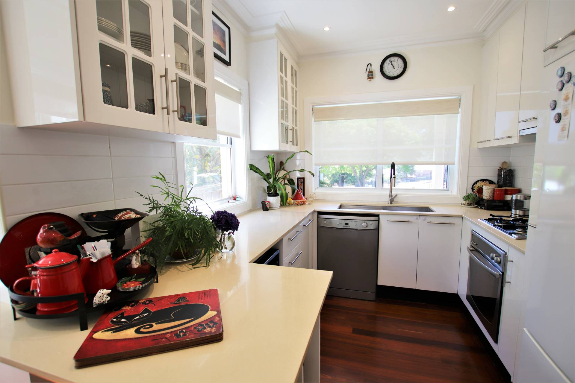 *  Well appointed sunny kitchen with Kleenmaid appliances – 900ml electric oven, 4 burner gas cooktop, stainless steel flue, dishwasher, double pantry, good storage, stone benchtops and breakfast bar