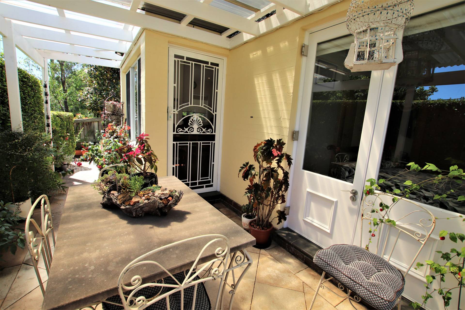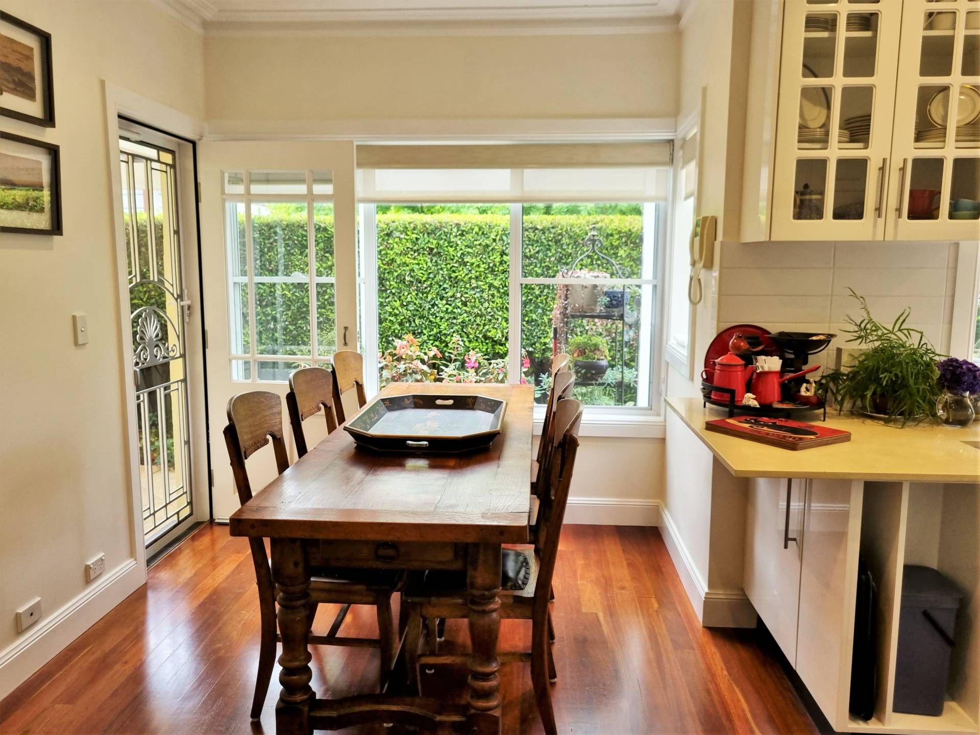 Casual meals area with door to sunny outside entertaining area with pergola