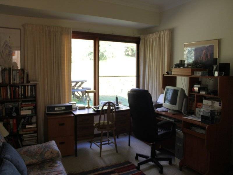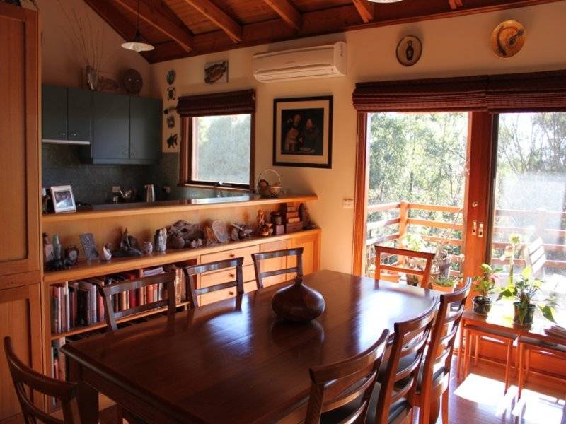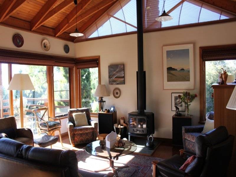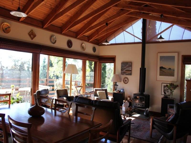 * open plan living and dining with raked ceilings (scissor trusses), tallowwood flooring, Danish slow combustion fire and doors to sunny verandah taking in the magnificent outlook