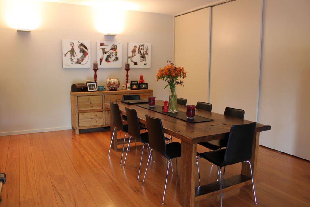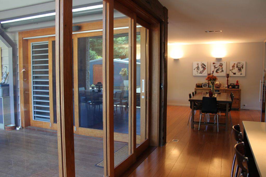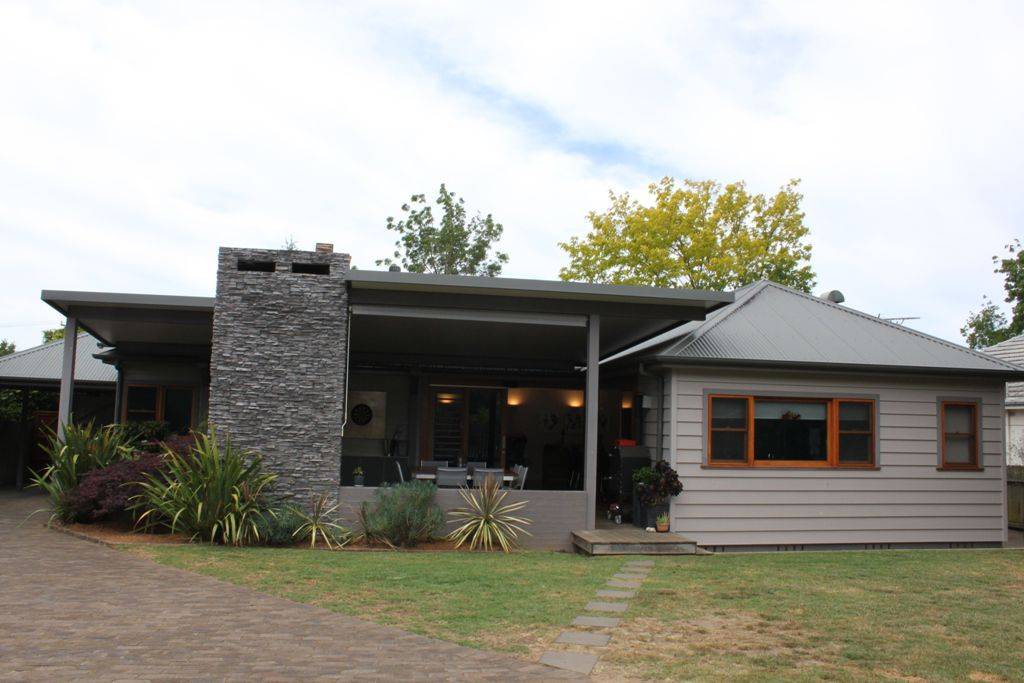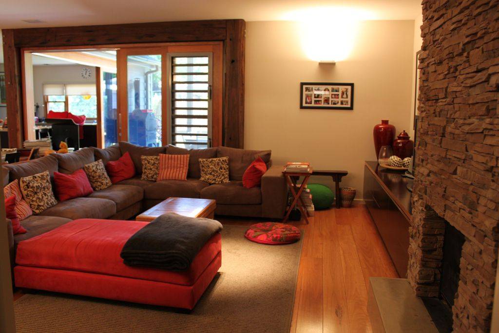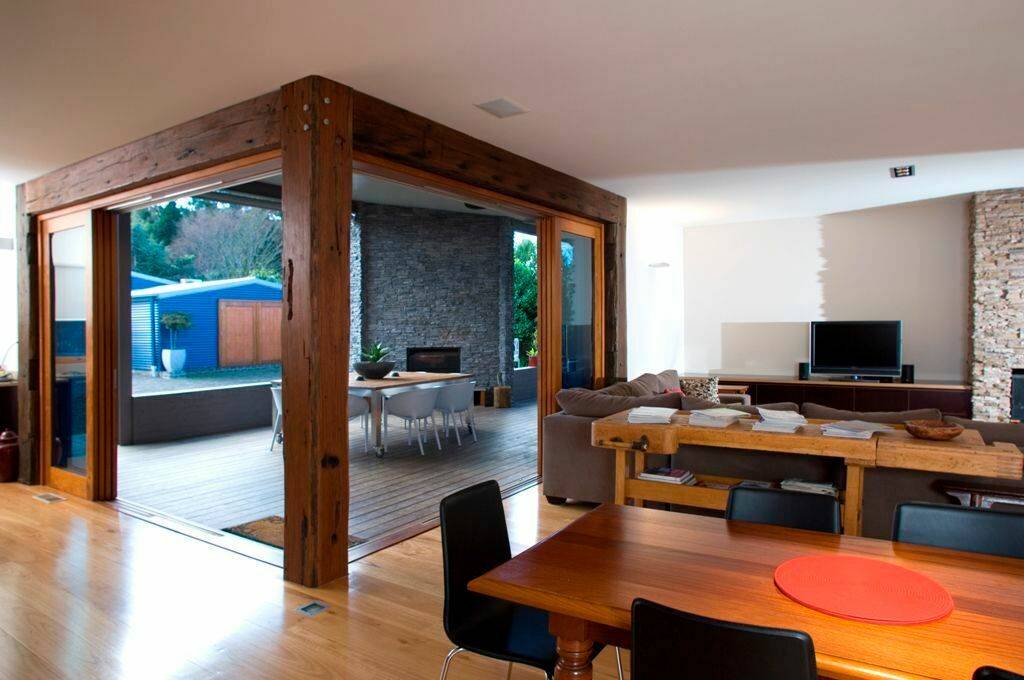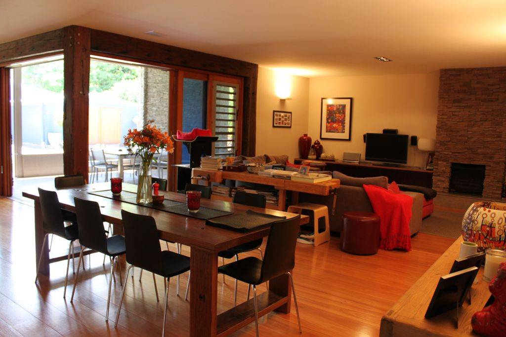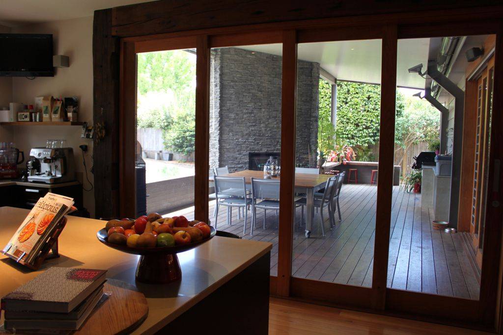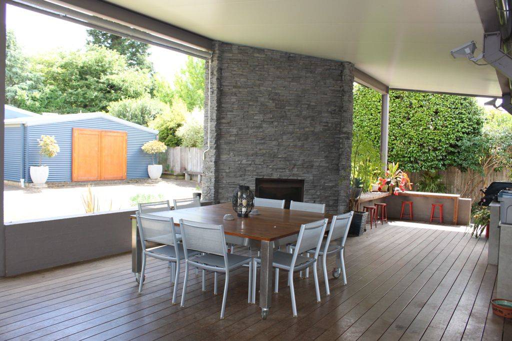 * open plan lounge & dining with stone fire-place, built-in storage & floor to ceiling sliding doors to large covered outdoor entertaining area with stone fire-place