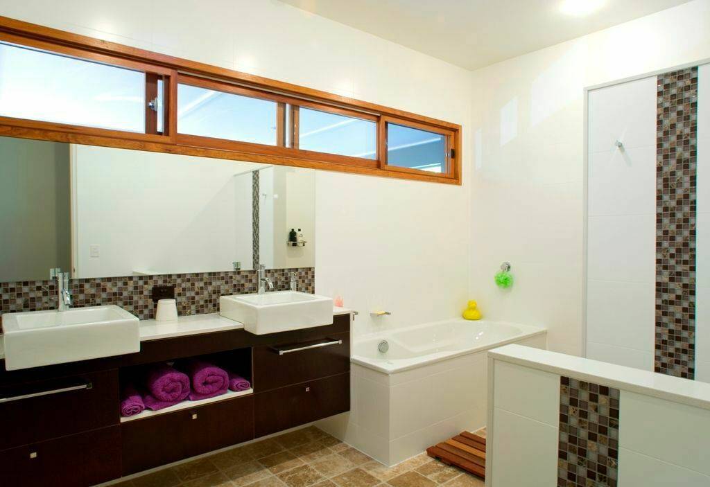 * main bathroom with double vanity, deep enamel bath, frameless, tiled walk-in shower, w.c. & under-floor heating