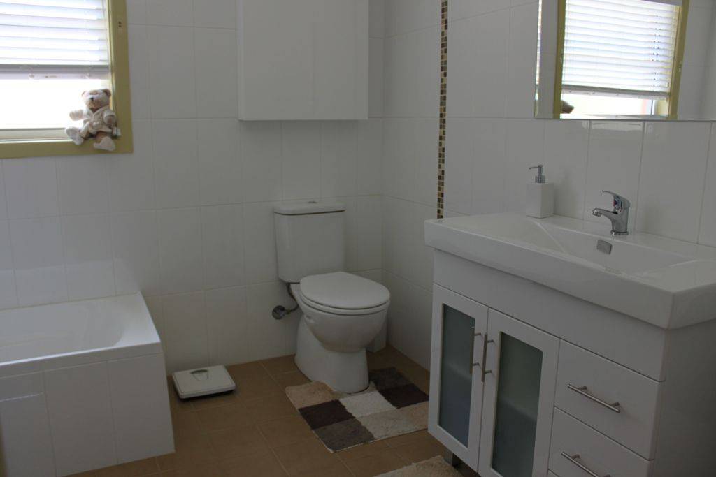 * fully tiled bathroom with frameless shower, bath, vanity, w.c. & tastic lights