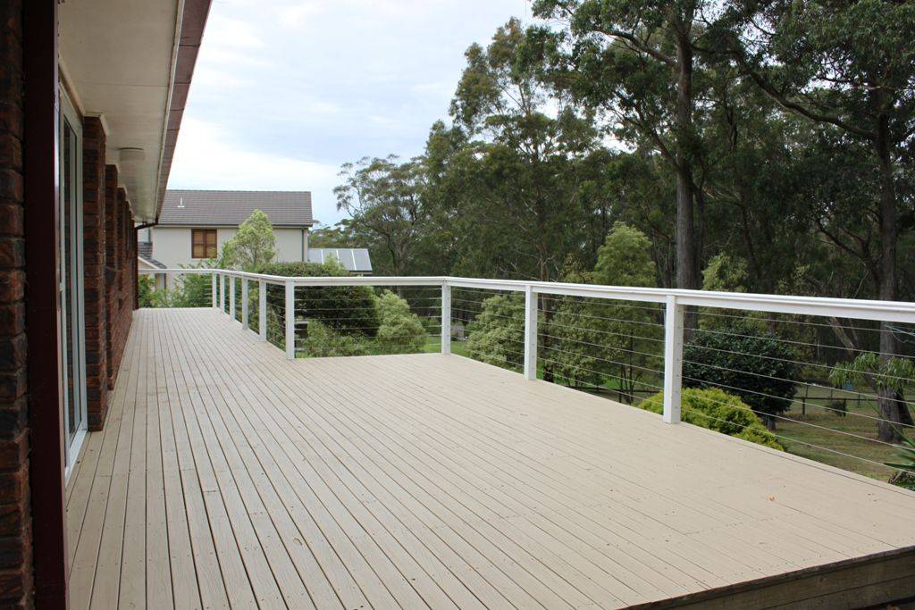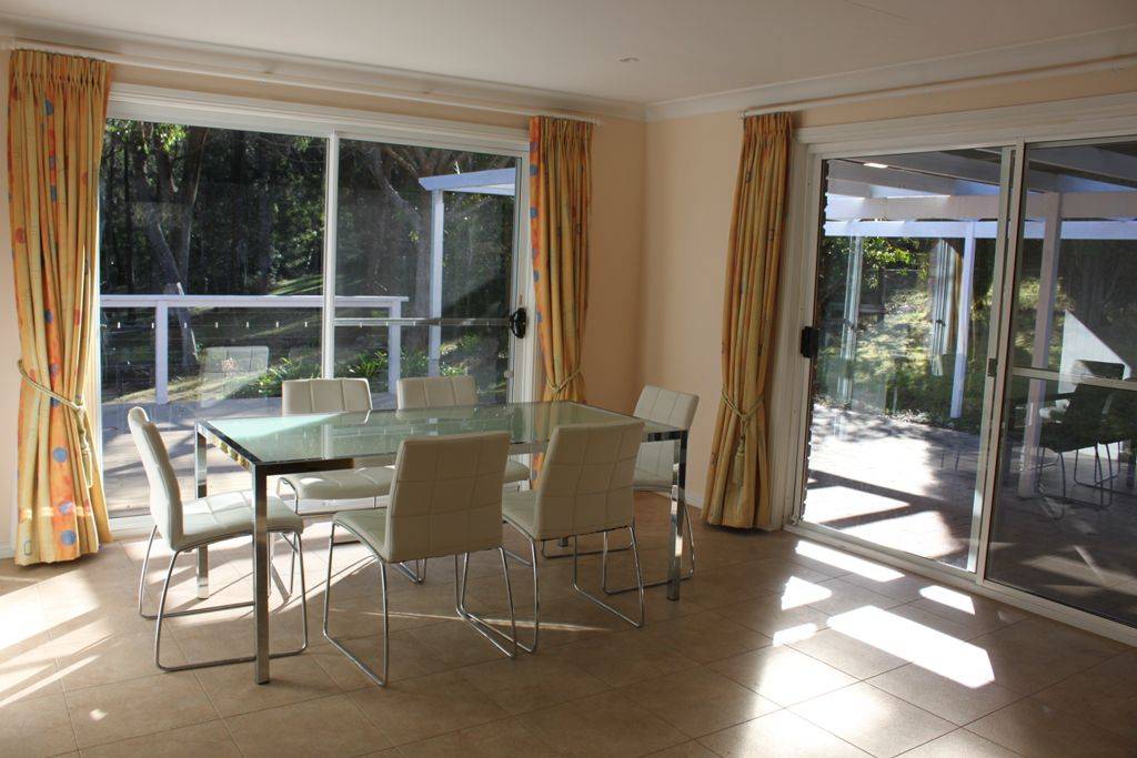 * dining adjacent to kitchen with sliding doors to large, sunny deck & outdoor entertaining area with views over the land