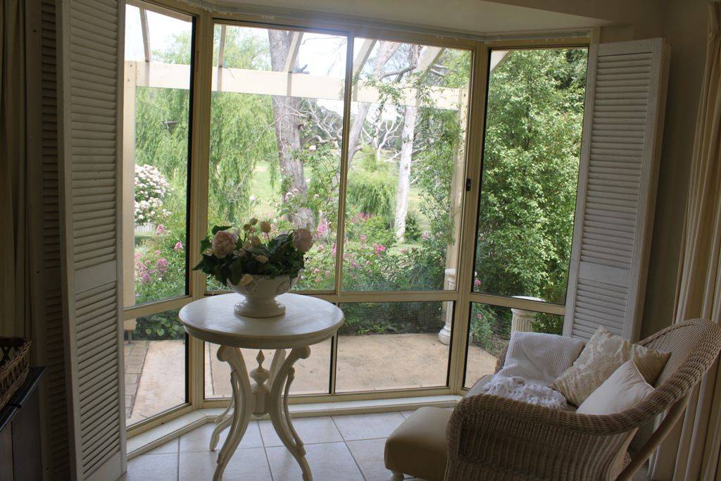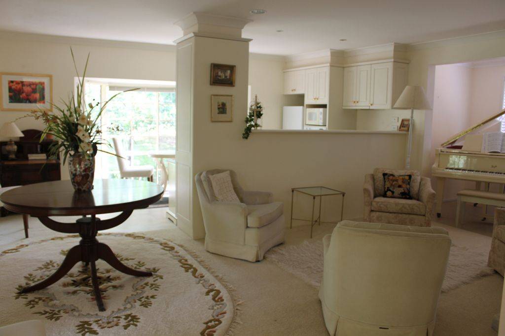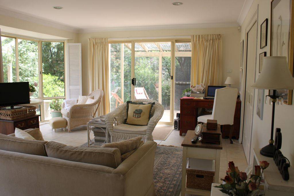 * family room adjacent to kitchen with bay windows & sliding doors to garden & covered outdoor entertaining area