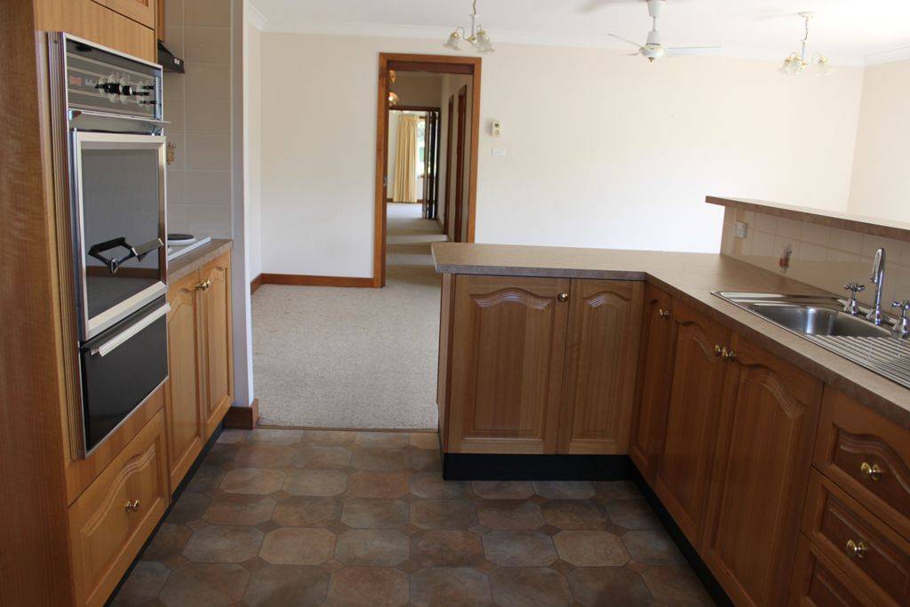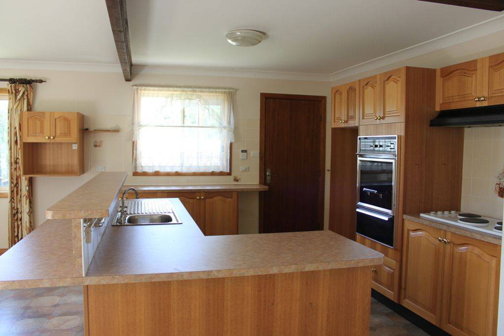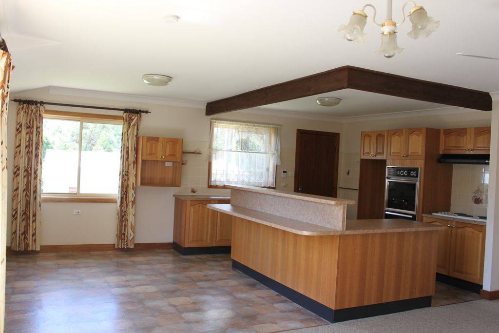 * Tassie oak kitchen with electric oven and hotplates, exhaust fan, good storage & breakfast bar
