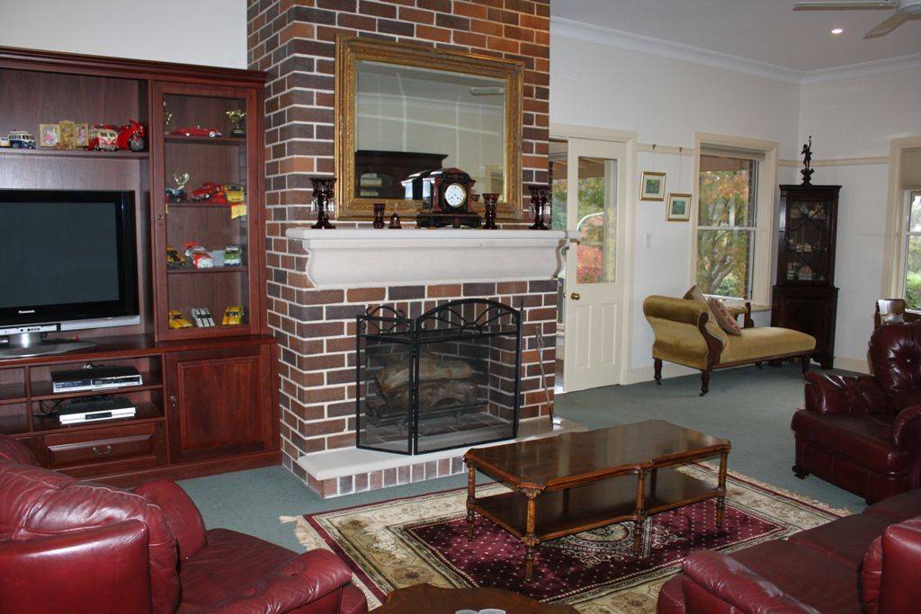* formal lounge & dining with open fire, sandstone mantle, French doors & large built-in wall unit